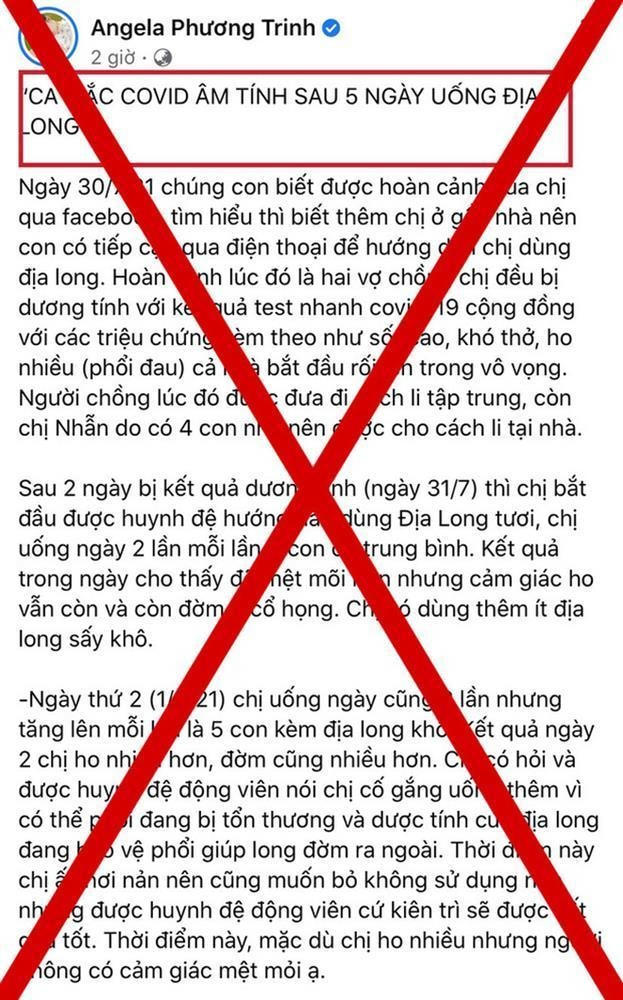 Thông tin mà nữ diễn viên đăng tải trên trang cá nhân về việc giun đất có thể chữa trị Covid-19.Thế nhưng, giới y khoa khẳng định chưa có bằng chứng khoa học nào về tác dụng của địa long trong điều trị Covid-19.