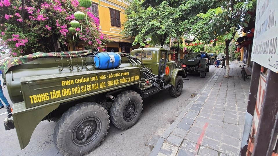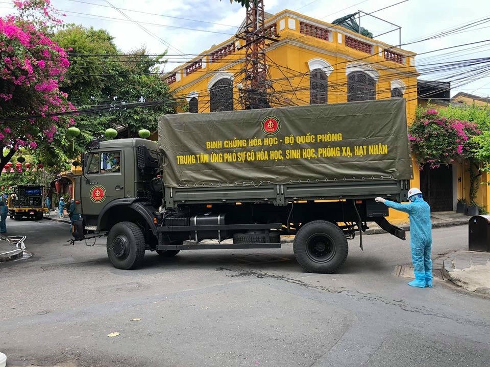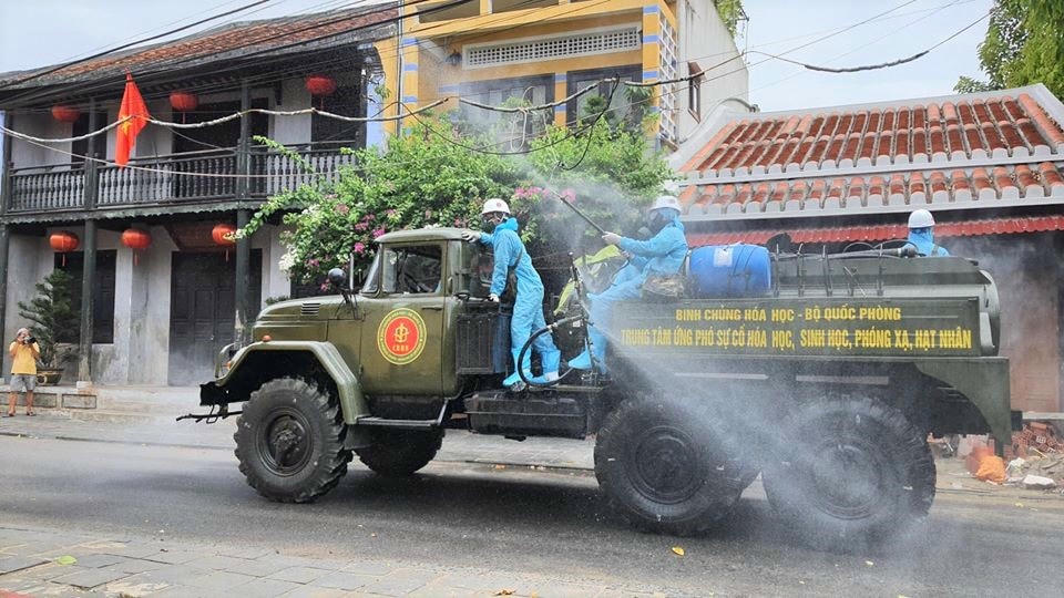 Sáng 2/8, lực lượng Trung tâm ứng phó sự cố hóa học, sinh học, phóng xạ, hạt nhân Bộ Quốc phòng phối hợp với Tiểu đoàn Hóa học 78 thuộc Quân khu 5 có mặt tại phố cổ Hội An, tỉnh Quảng Nam để tổ chức phun hóa chất khử trùng.
