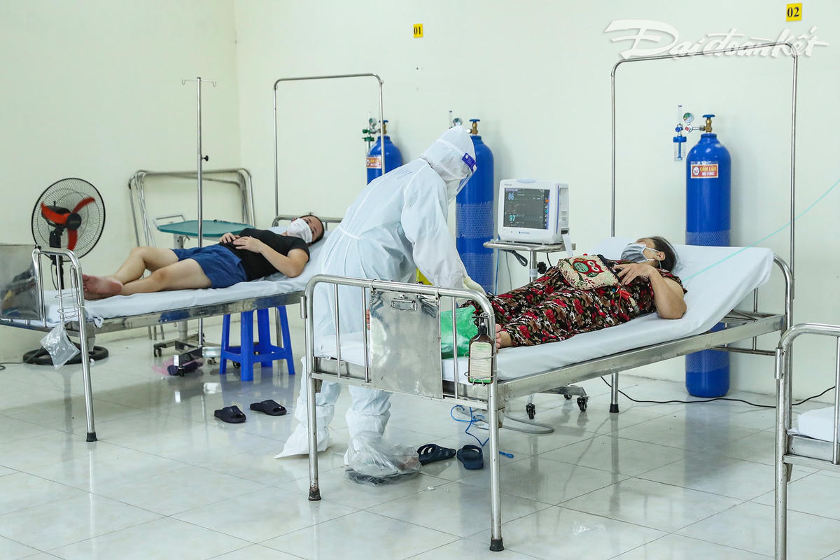 Từng khu vực đều được ghi rõ biển báo. Tất cả các y, bác sĩ vào khu vực có bệnh nhân đều phải thực hiện mặc đồ bảo hộ đúng quy trình, đảm bảo đúng các quy định trong phòng, chống dịch Covid-19. Ảnh: Quang Vinh. Mỗi phòng có 6 bệnh nhân được sắp xếp một cách khoa học, những bệnh nhân cũng được yêu cầu đeo khẩu trang trong phòng. Mỗi phòng sẽ có một nhóm Zalo để cập nhật các thông tin sức khoẻ của từng bệnh nhân theo ngày và để liên hệ với các y, bác sỹ một cách nhanh nhất. Ảnh: Quang Vinh. Khu vực đón tiếp bệnh nhân cũng được sắp xếp riêng biệt, các y, bác sĩ sẽ thay phiên nhau trực tại đây. Ảnh: Quang Vinh. Khu vực đón tiếp được bố trí tại sảnh tầng 1, diện tích lớn, các ghế được kê xa nhau đảm bảo khoảng cách. Các y, bác sĩ sẽ thay phiên trực 24/7 tại đây để đón tiếp bệnh nhân. Mỗi bệnh nhân sẽ thực hiện khai báo thông tin với các y, bác sĩ trước khi nhập viện. Ảnh: Quang Vinh. Đây là khu vực cấp cứu. Đối với những bệnh nhân có diễn biến, cần thở oxy sẽ được đưa xuống khu vực này. Các y, bác sĩ sẽ theo dõi nhiệt độ và các chỉ số cần thiết của bệnh nhân. Ảnh: Quanh Vinh. Các bệnh nhân xuống khu vực cấp cứu sẽ được theo dõi liên tục các chỉ số. Ảnh: Quang Vinh. Các điều dưỡng vừa thực hiện nhiệm vụ của mình, vừa quan tâm, chăm sóc bệnh nhân như những người thân, hỗ trợ bệnh nhân từ những điều nhỏ nhặt nhất. Ảnh: Quang Vinh.
