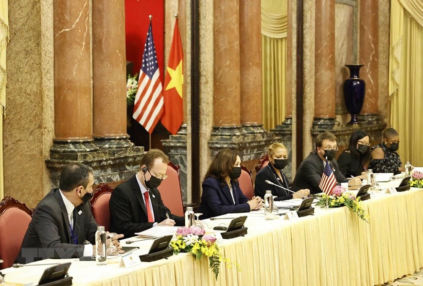 Sáng 25/8, tại Phủ Chủ tịch, Chủ tịch nước Nguyễn Xuân Phúc tiếp Phó Tổng thống Mỹ Kamala Harris thăm Việt Nam. Ảnh: TTXVN.Chuyến thăm nhằm làm sâu sắc hơn quan hệ Đối tác toàn diện Việt Nam-Mỹ, vì lợi ích của nhân dân hai nước, vì hòa bình, ổn định, hợp tác và phát triển của khu vực và trên thế giới. (Ảnh: Thống Nhất/TTXVN).Chuyến thăm Việt Nam của bà Kamala Harris cũng là chuyến thăm Việt Nam đầu tiên của một Phó Tổng thống Mỹ đương nhiệm. Bà Kamala Harris là người phụ nữ da màu đầu tiên trở thành Phó Tổng thống Mỹ. Ảnh: TTXVN.Chuyến thăm cũng góp phần tăng cường quan hệ và mở rộng hợp tác kinh tế giữa Washington và các đối tác quan trọng trong khu vực Ấn Độ Dương-Thái Bình Dương. (Ảnh: Thống Nhất/TTXVN).Chủ tịch nước Nguyễn Xuân Phúc nhấn mạnh hai bên sẽ đẩy mạnh hợp tác nhiều mặt để củng cố lòng tin. (Ảnh: Thống Nhất/TTXVN).
