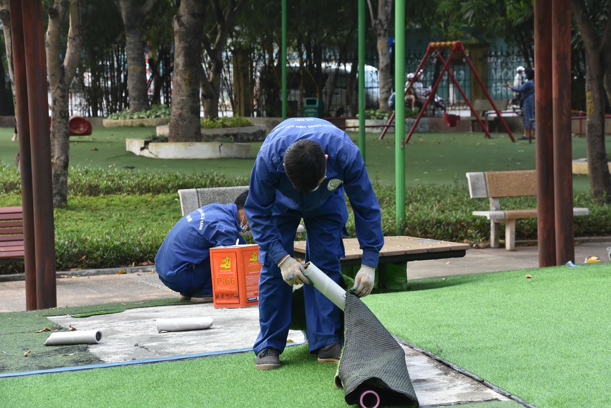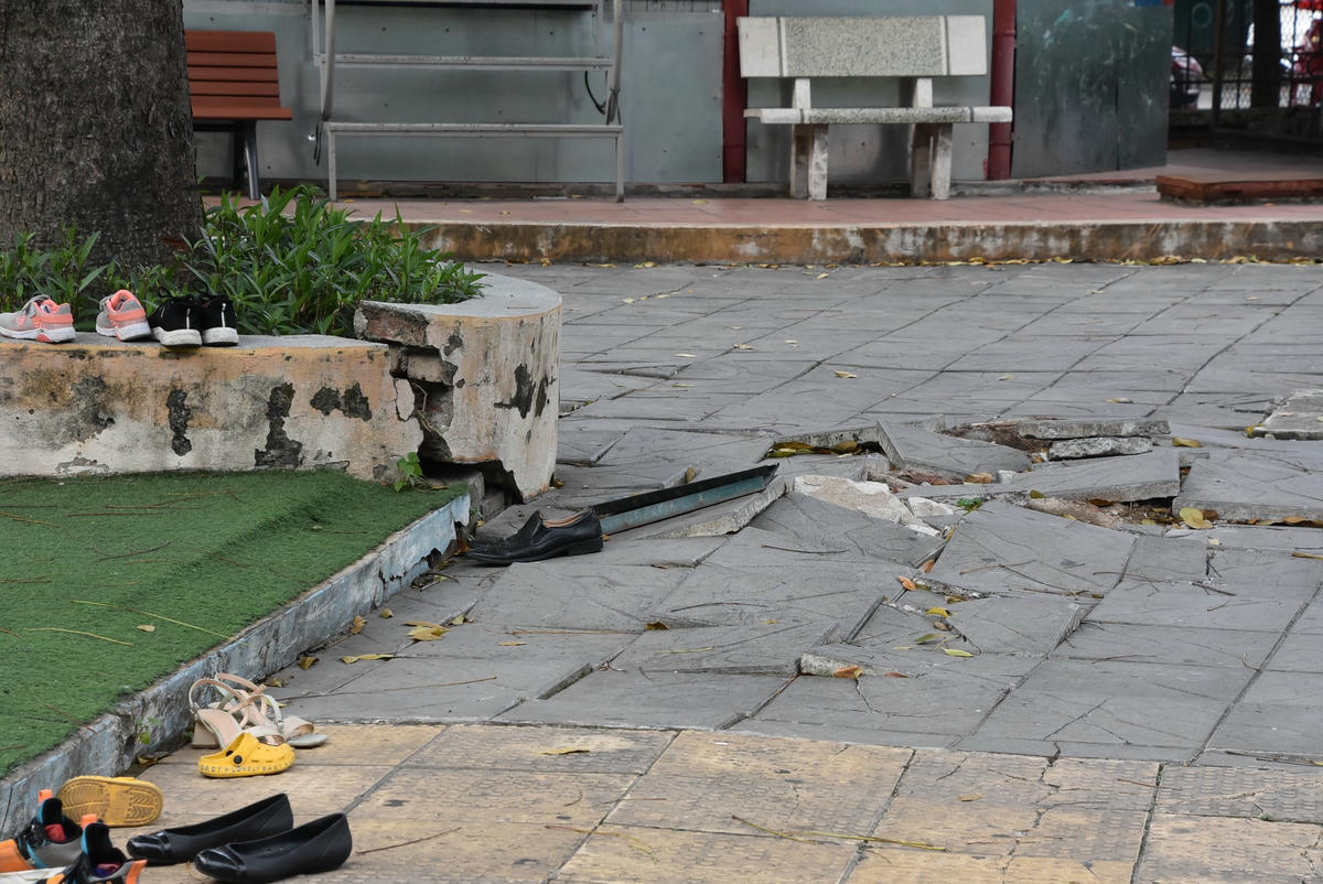 [ẢNH] Công viên Cầu Giấy: Gạch đá nham nhở, khu vui chơi cho trẻ hư hỏng nặng