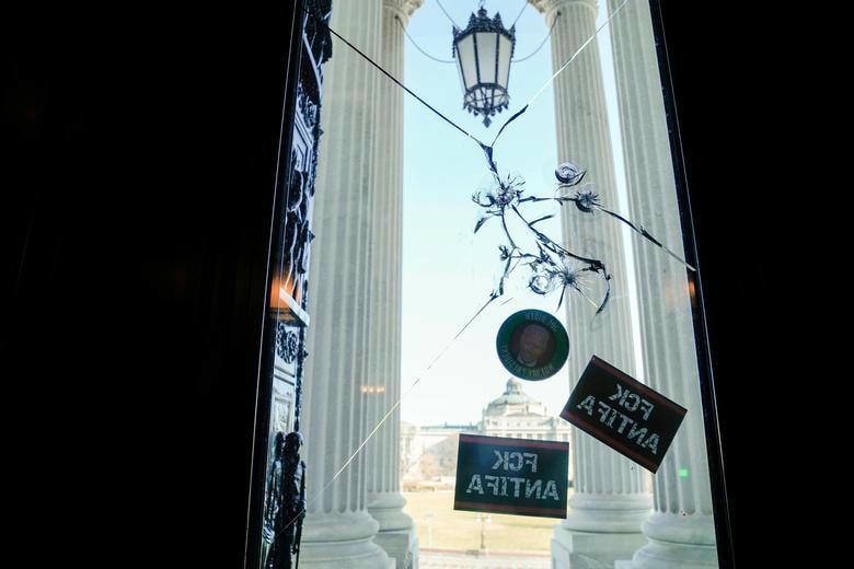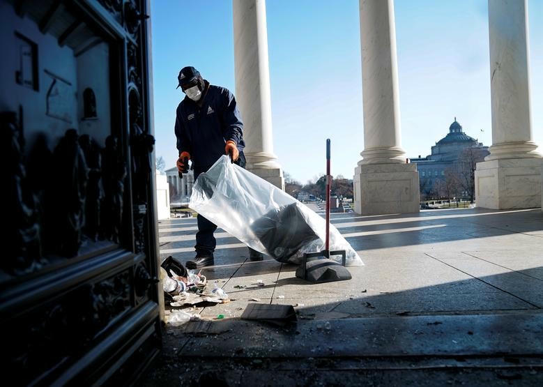 Một ngày sau khi những người ủng hộ Tổng thống Trump xông vào điện Capitol, nhiều công nhân phải nỗ lực dọn dẹp cả bên ngoài và bên trong tòa nhà.