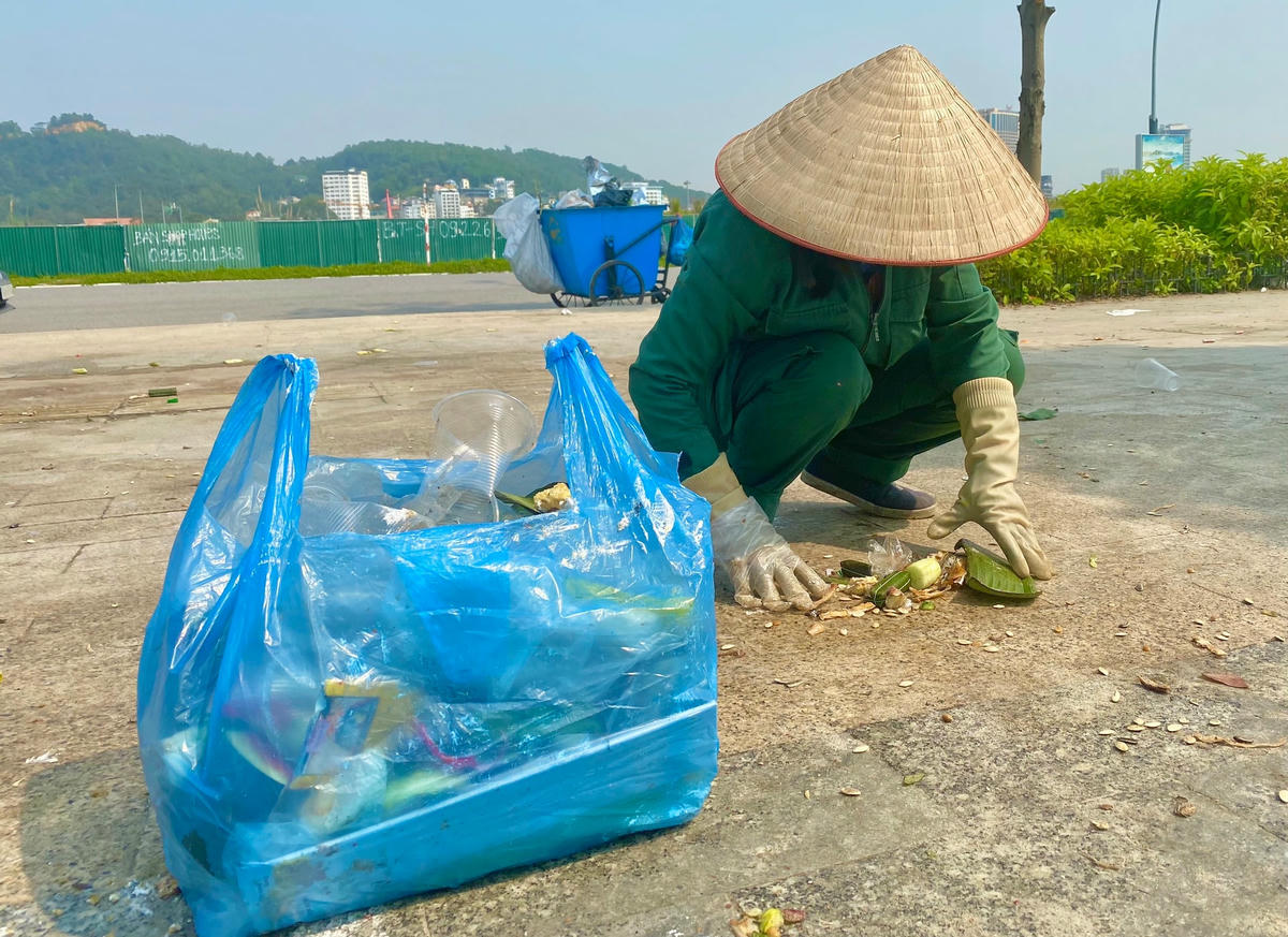 Theo ghi nhận của phóng viên Đại Đoàn Kết Online vào sáng ngày 6/4, tại khu vực vỉa hè chạy dọc đường Di Sản (phường Bãi Cháy, TP Hạ Long) sát cạnh các bãi tắm, những công nhân dọn vệ sinh đều tất bật và phải luôn tay để nhanh chóng thu gom, xử lý những đống rác thải do khách du lịch “bỏ quên”.