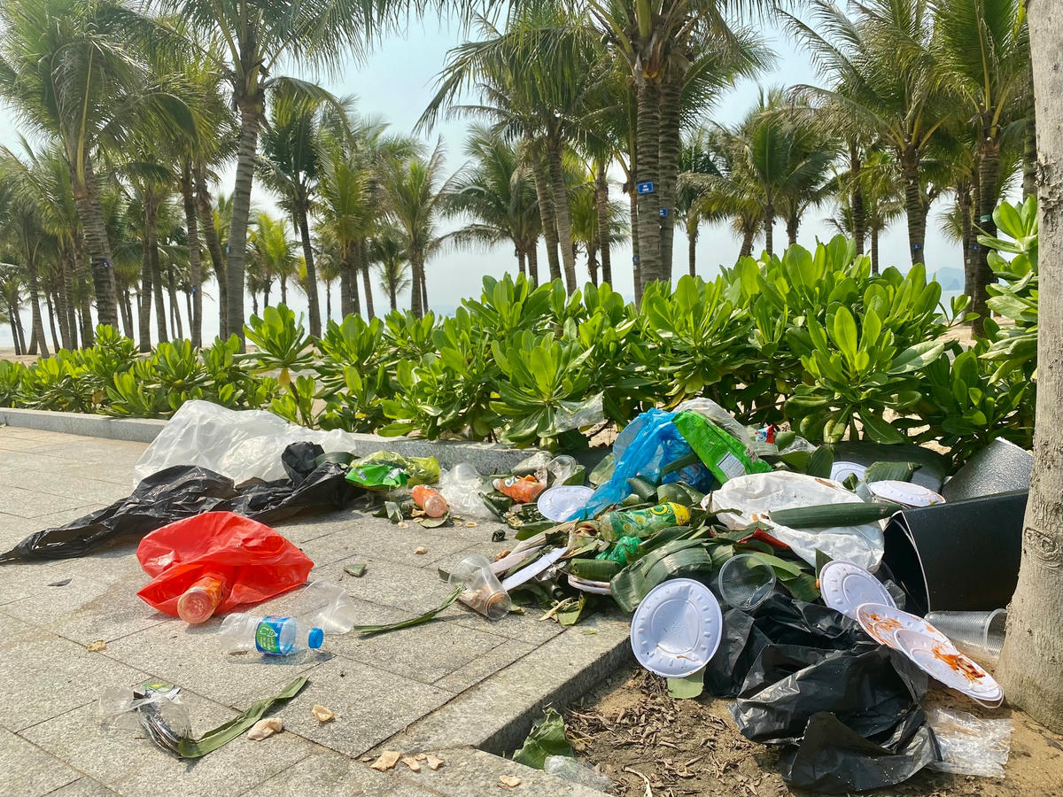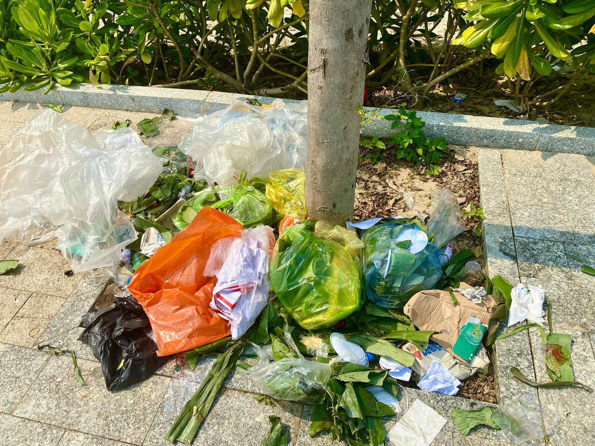 Mỗi đống cách nhau chừng vài mét, bốc mùi hôi thối do có tạp nham đủ thể loại rác từ vỏ nem chua, vỏ trái cây, chai lọ nhựa, cốc đĩa nhựa,… gây mất vệ sinh môi trường và khiến ai đi qua cũng thấy phản cảm.