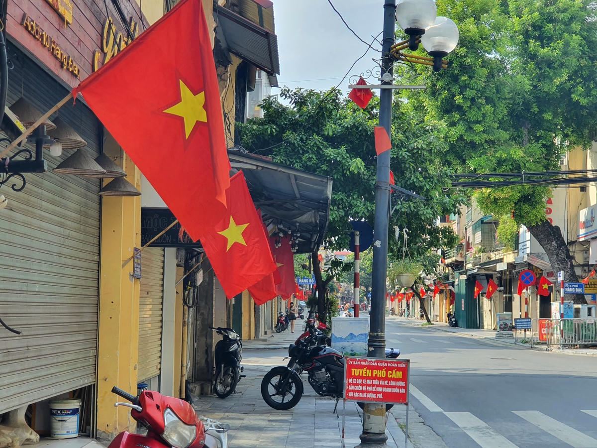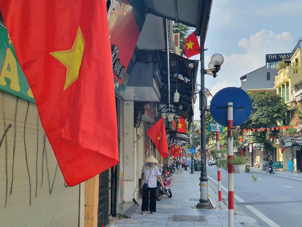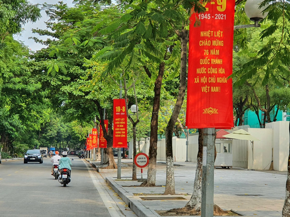 Nhiều tuyến phố của thủ đô được trang hoàng cờ hoa, đỏ rực cả một góc trời. Năm nay Quốc khánh 2/9 diễn ra trong bối cảnh tình hình dịch Covid-19 đang diễn biến phức tạp, Thủ đô đang thực hiện siết chặt giãn cách xã hội cùng nhiều biện pháp phòng chống lây lan của dịch bệnh.
