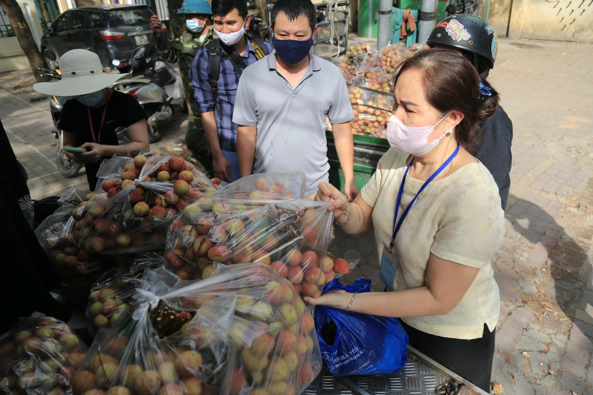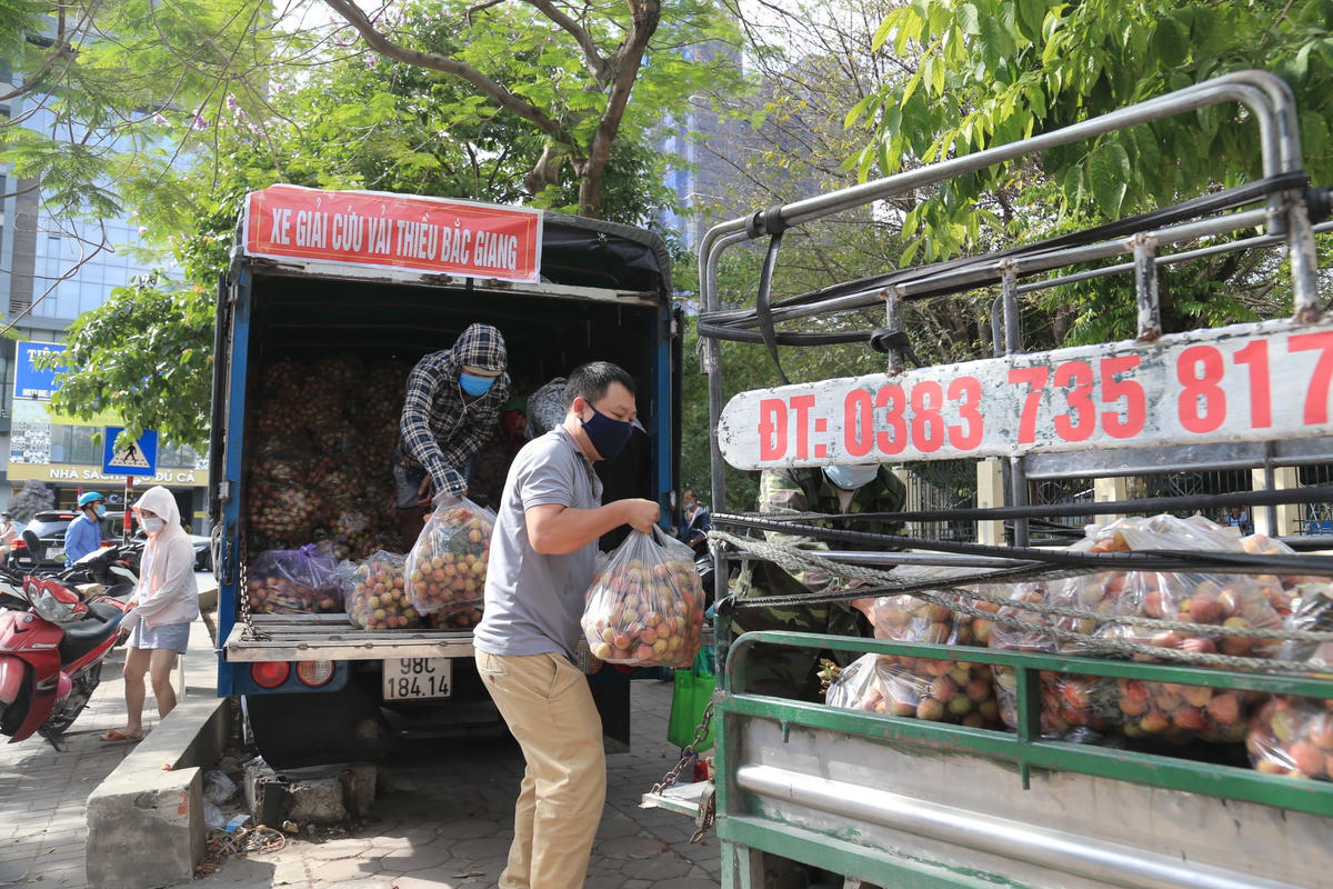 Các điểm giải cứu vải thiều Bắc Giang trên đường phố Hà Nội thu hút nhiều người tiêu dùng Thủ đô.Chị Nghiêm Thị Thanh Thủy (41 tuổi, quê ở Bắc Giang), trưởng nhóm thiện nguyện, cho biết do tình hình dịch ở Bắc Giang diễn biến phức tạp nên đã tổ chức hoạt động này góp phần giúp nông dân tiêu thụ nông sản.Các điểm giải cứu vải thiều được chị Thủy tổ chức tại nhiều địa điểm (85 Vũ Trọng Phụng, số 10 Nguyễn Trãi, 75 Đại Cồ Việt…).Rất đông khách hàng đến ủng hộ.Việc thu mua, vận chuyển được thực hiện theo đúng quy định phòng chống dịch. Xe được phun khử khuẩn để bảo đảm sức khỏe người tiêu dùng và phòng chống Covid-19.Chị Thủy cho biết vải được vận chuyển từ huyện Tân Yên, tỉnh Bắc Giang, đạt tiêu chuẩn VietGAP và thường được xuất khẩu sang thị trường Trung Quốc.Giá vải thiều tại đây là 20.000 đồng/kg. Vì lượng người mua đông, nhóm quyết định đóng vải thiều vào các bao nylon, mỗi bao 10 kg, giá 200.000 đồng.Nhiều người mua với số lượng rất lớn.Vải ngon và mọng nước, rất phù hợp cho những ngày nắng nóng.Bên cạnh việc bán trực tiếp tại các điểm giải cứu, nhóm cũng nhận vận chuyển hàng tận nơi nếu có khách yêu cầu.