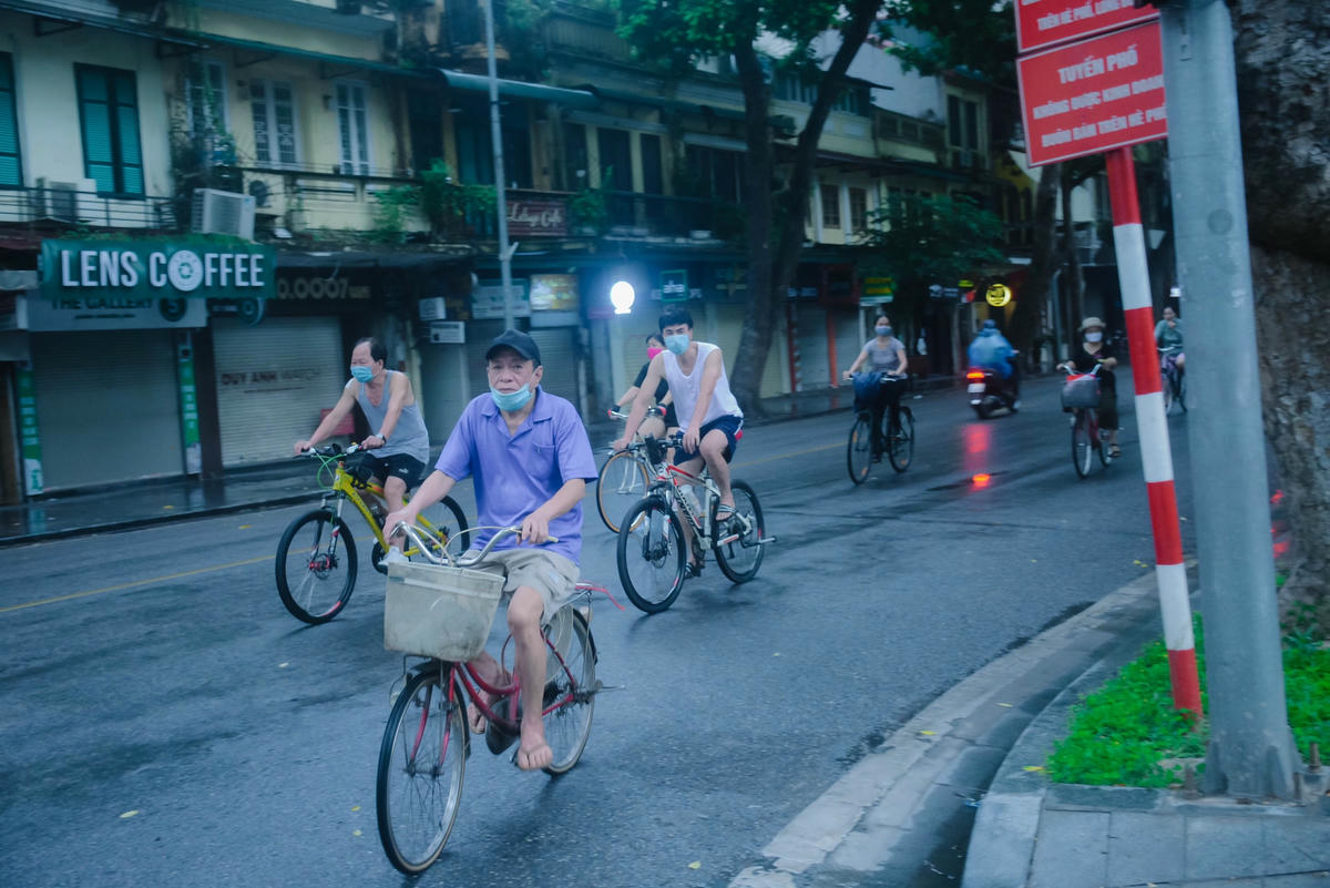 6h sáng 9/7, sau lệnh cấm từ 18h00 ngày 8/7 tạm dừng các hoạt động thể dục, thể thao ngoài trời, vẫn có nhiều người tập thể, thể thao ngoài trời tại Hồ Gươm.Trước tình hình diễn biến phức tạp của dịch Covid-19 nhưng người dân tham gia tập thể dục vẫn không đẹo khẩu trang, hoặc đeo hở mũi.Người dân đạp xe dưới lòng đường các tuyến phố Đinh Tiên Hoàng, Lê Thái Tổ, Hàng Khay... vẫn đông đúc.Sau khi đạp xe, song một số người dừng lại để chụp ảnh.“Có thói quen dậy sớm tập thể dục nhiều năm nay, tôi rất buồn khi nhận được tin tạm dừng các hoạt động thể dục thể thao ngoài trời, chỉ đành tập thể dục trước cửa nhà, không tiếp xúc hay nói chuyện với bất kỳ ai, để phòng tránh lây lan dịch bệnh cho bản thân mình”, ông An cho biết.Nhiều người vẫn bất chấp khuyến cáo về hạn chế ra khỏi nhà khi không thực sự cần thiết, tránh tụ tập đông người của TP Hà Nội.Lực lượng chức năng lập rào chắn tại công viên, nơi công cộng để tránh tụ tập đông người.Tuy nhiên, nhiều người vẫn vô tư giữ thói quen tập thể dục nơi công cộng.