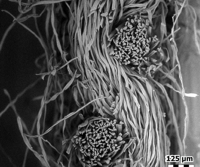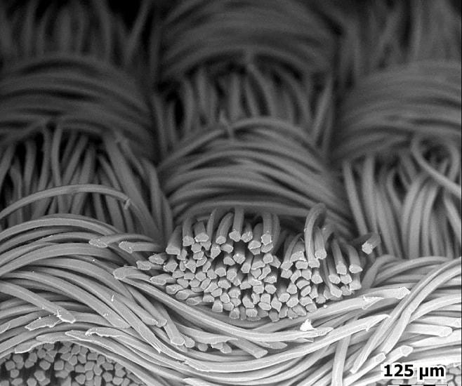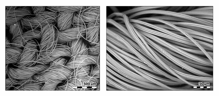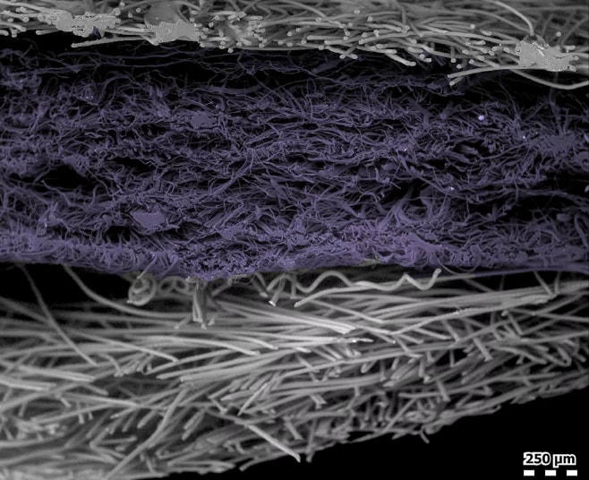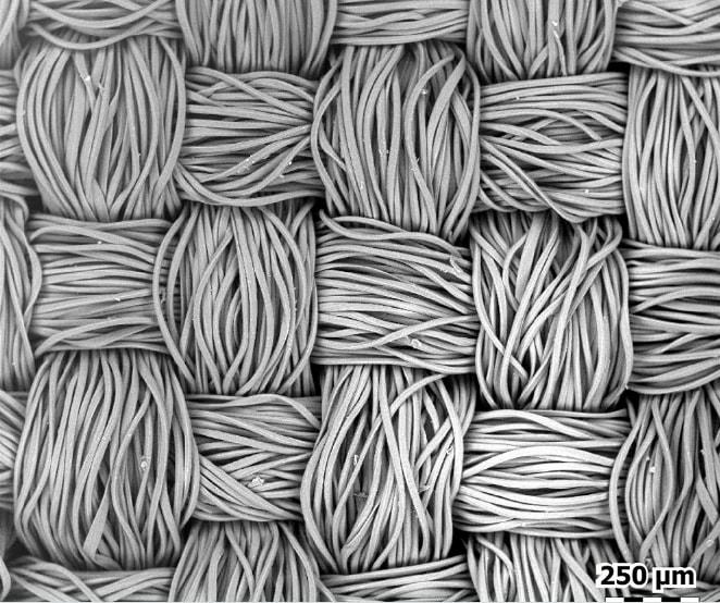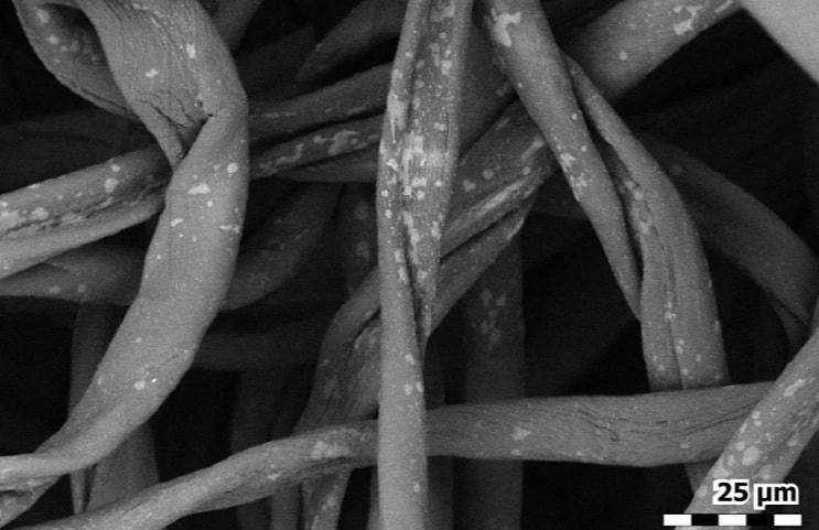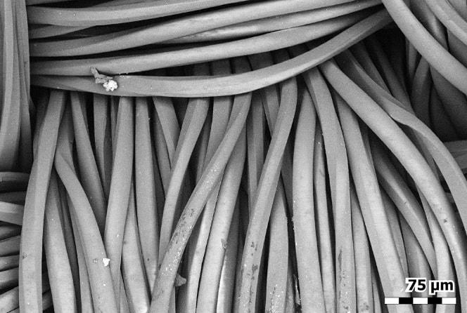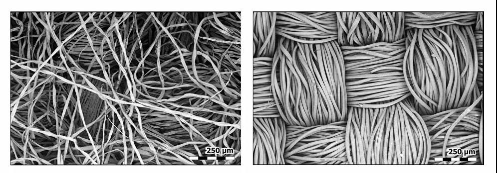 Các sợi của khẩu trang làm bằng tơ nhân tạo.Hình ảnh giả màu cho thấy mặt cắt của một lớp khẩu trang N95.Các sợi riêng lẻ trong khẩu trang bằng vải nỉ bông.Các sợi của khẩu trang polyester.Sợi của khẩu trang bằng polyester.Hình ảnh từ trên xuống của khẩu trang bằng vải nỉ bông (L) và polyester.Sợi polyester trong khẩu trang.