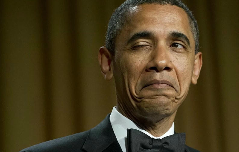 Cựu Tổng thống Mỹ Barack Obama nháy mắt khi kể chuyện cười về nơi sinh của mình trong bữa tối của Hiệp hội Phóng viên Nhà Trắng ở Washington, DC, năm 2012.