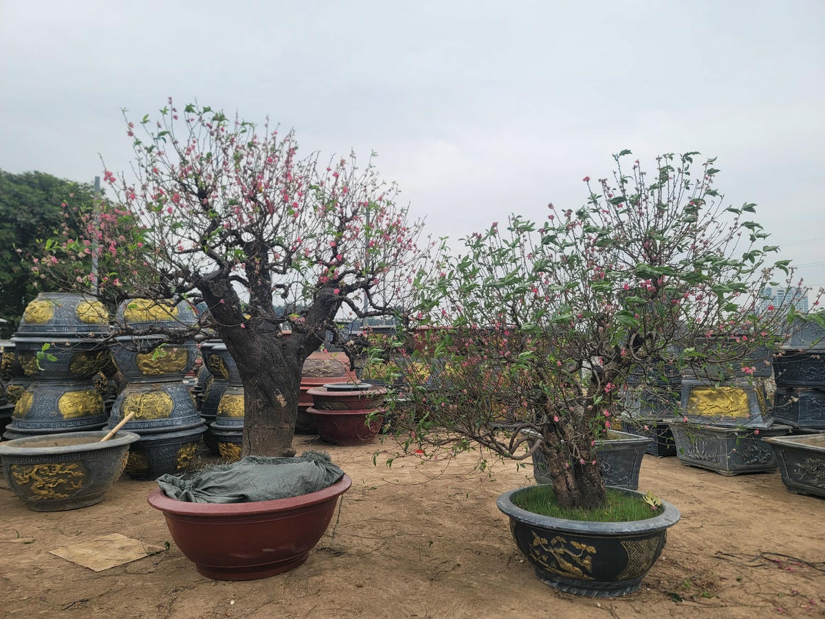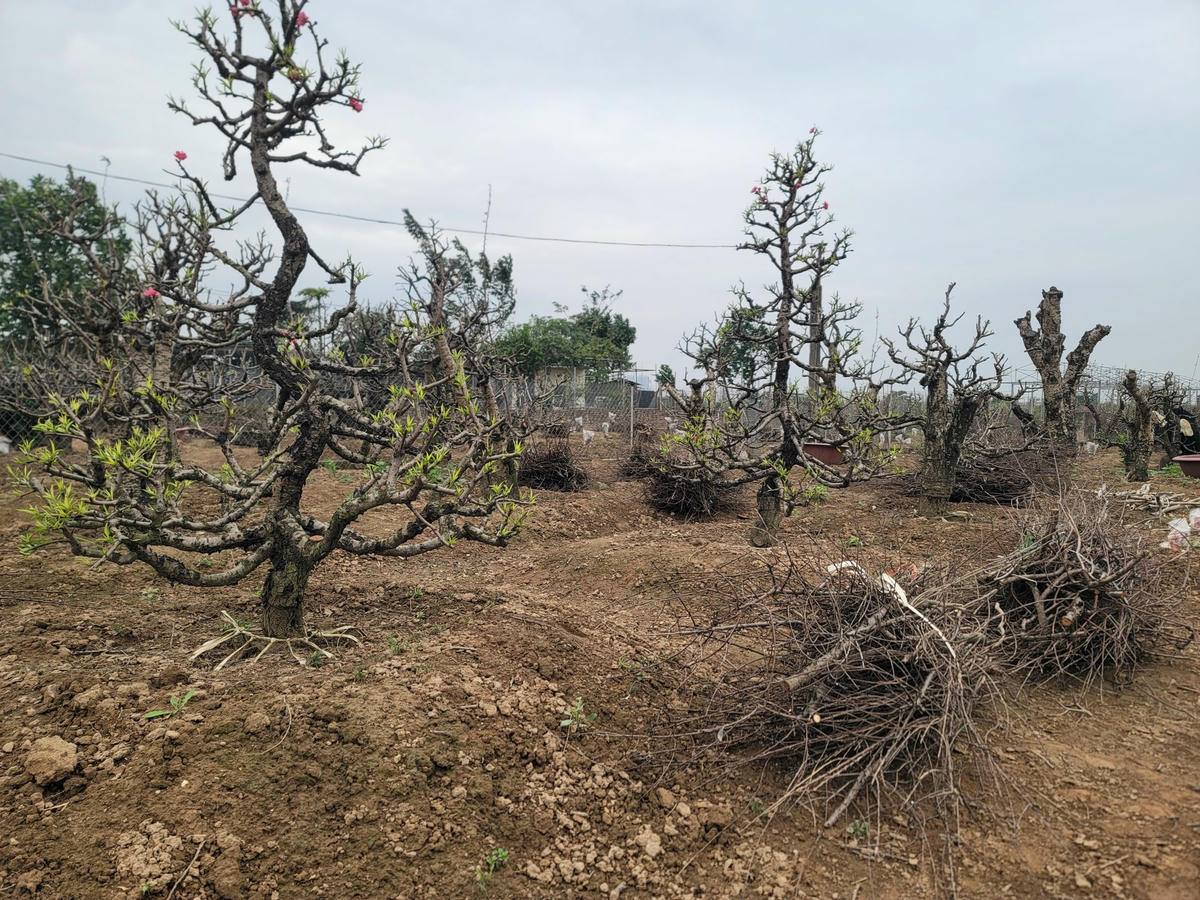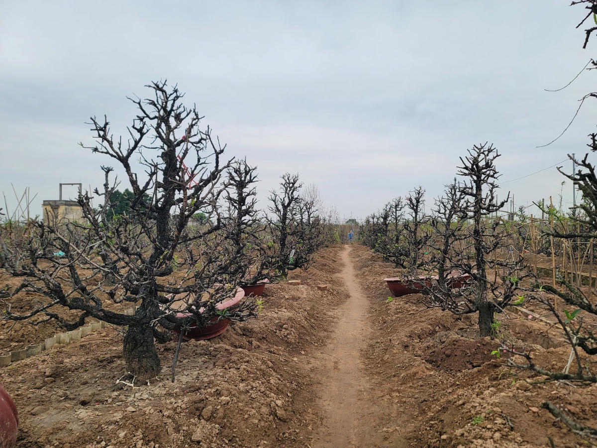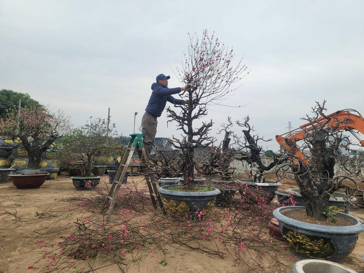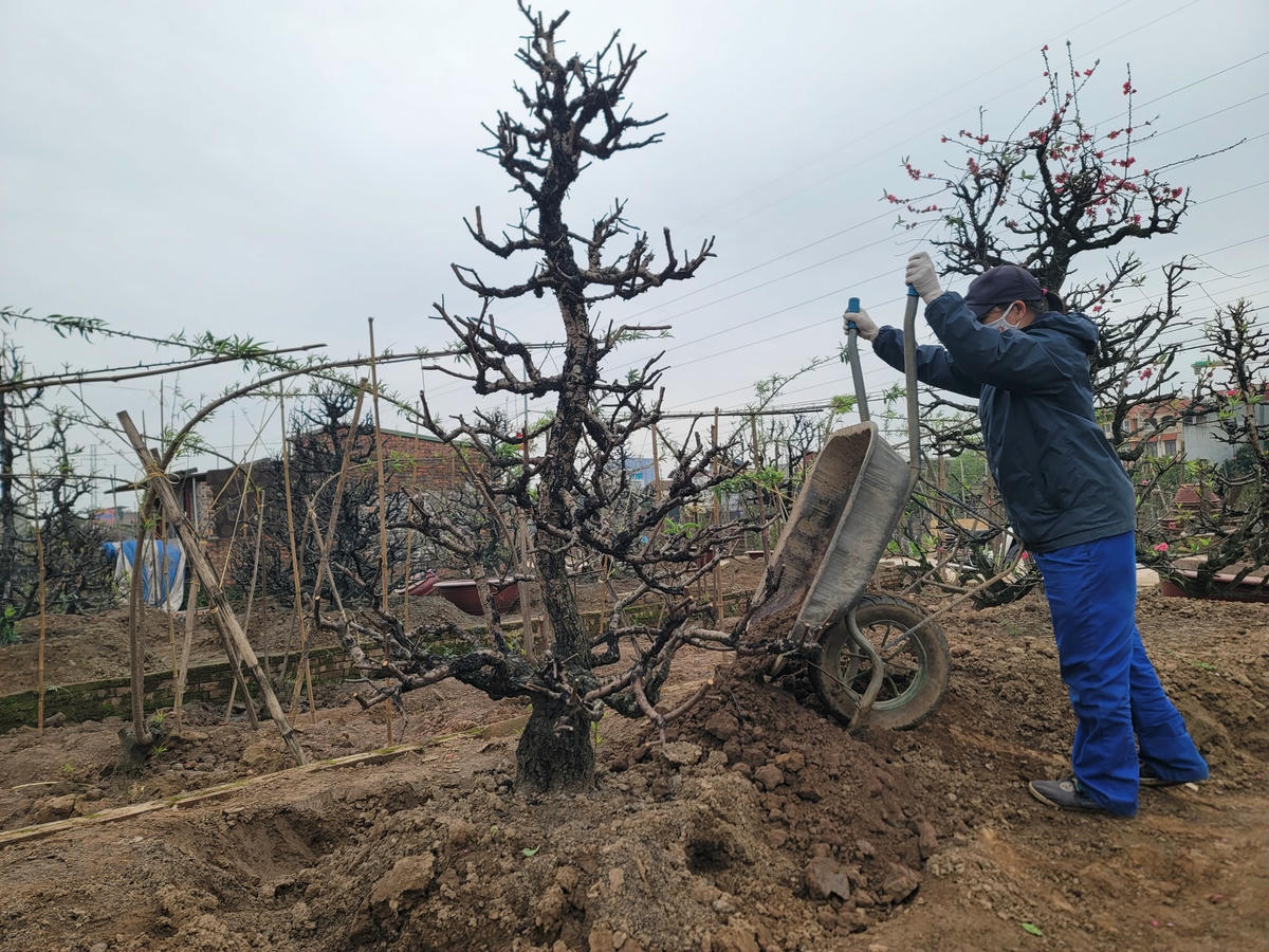 Về làng Nhật Tân (quận Tây Hồ, Hà Nội) những ngày cuối tháng Giêng, dễ dàng bắt gặp hình ảnh quen thuộc - những vườn đào cắt tỉa hết cành lá.Trở lại vườn, những gốc đào được chuyển từ chậu ra trồng ngoài đất để nuôi dưỡng.Đổ đất đắp cho gốc cây.Một số vườn đào phải mướn thêm người làm cho kịp thời vụ.Vườn nhà bác Học, 76 tuổi có gần 500 gốc, năm nay chỉ cho thuê được khoảng hơn trăm gốc nhưng cũng thấy phấn khởi do tình hình kinh tế sau dịch Covid-19 khó khăn chung.Tại một số vườn đào, các cây trồng lại đã được phủ vôi để chống sâu bọ.Nhìn xa không khác gì phủ lớp tuyết trắng xoá.Một "cụ" đào vừa cắt tạo dáng đã được bọc, che cẩn thận.Những bó cành đào cắt từ cây được gom lại.Những gốc đào lớn "về nhà" bằng xe cẩu tự hành.Chủ vườn đào Tuấn Việt đang cắt tỉa cây vừa cho thuê về để chuẩn bị mang đi trồng.Sau mỗi mùa, cây đào sẽ được cắt hết cành nhỏ, tạo dáng rồi cho ra đất trồng cho cây có điều kiện phát triển.Đủ các loại công cụ làm vườn.Hình ảnh quen thuộc trước cổng mỗi vườn đào.