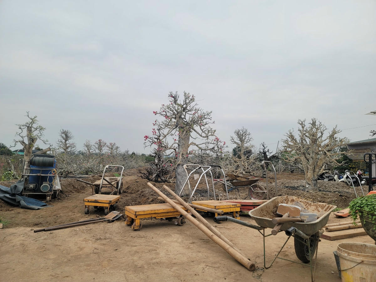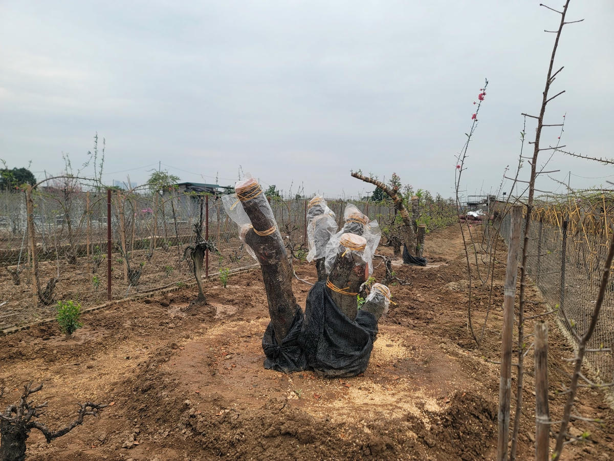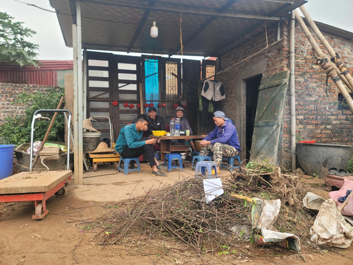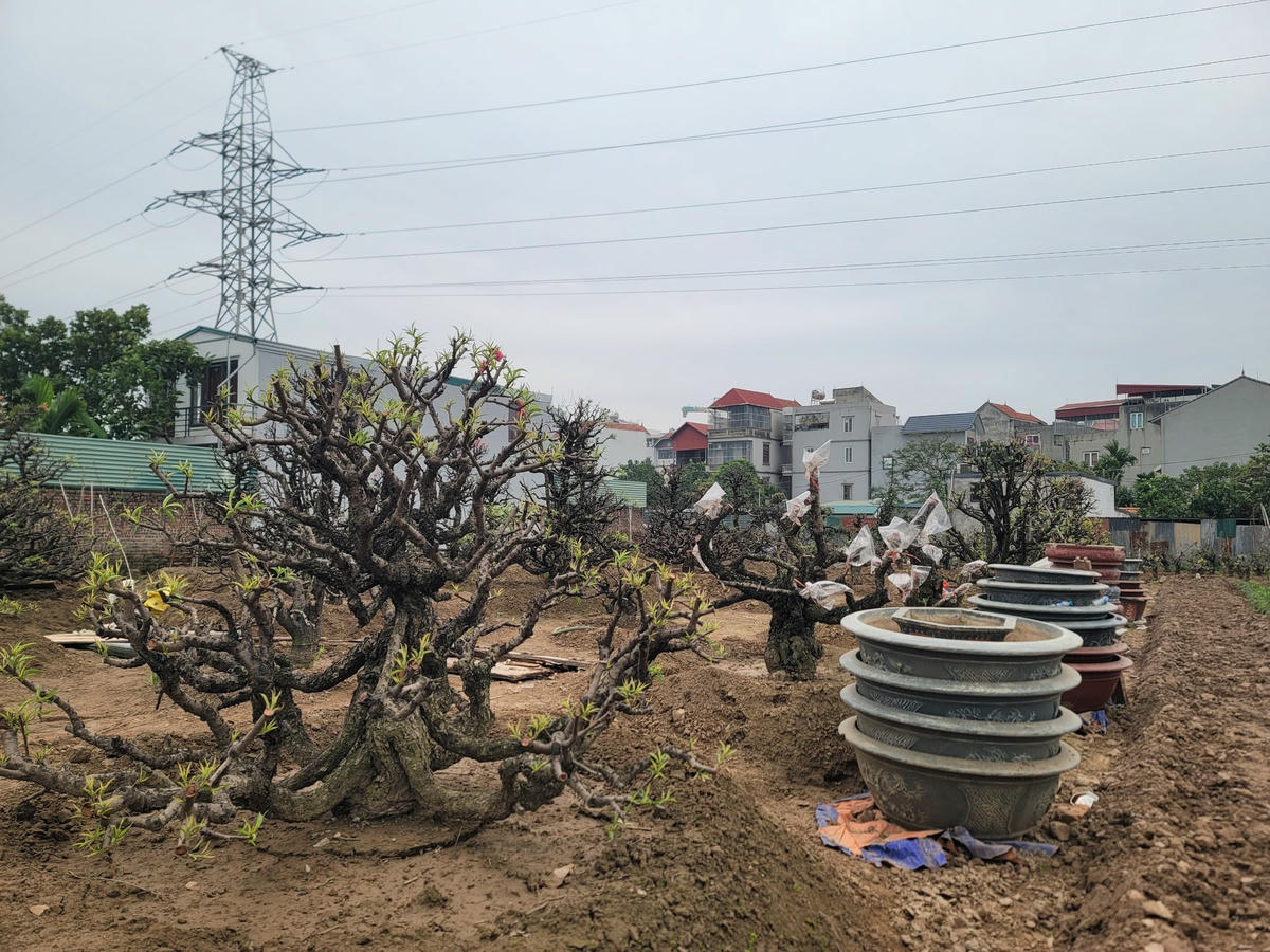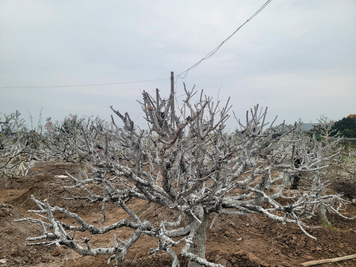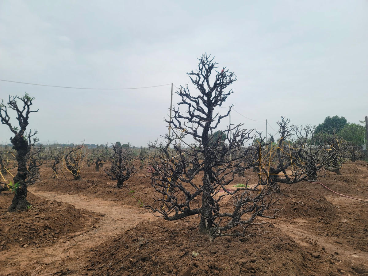 Về làng Nhật Tân (quận Tây Hồ, Hà Nội) những ngày cuối tháng Giêng, dễ dàng bắt gặp hình ảnh quen thuộc - những vườn đào cắt tỉa hết cành lá.Trở lại vườn, những gốc đào được chuyển từ chậu ra trồng ngoài đất để nuôi dưỡng.Đổ đất đắp cho gốc cây.Một số vườn đào phải mướn thêm người làm cho kịp thời vụ.Vườn nhà bác Học, 76 tuổi có gần 500 gốc, năm nay chỉ cho thuê được khoảng hơn trăm gốc nhưng cũng thấy phấn khởi do tình hình kinh tế sau dịch Covid-19 khó khăn chung.Tại một số vườn đào, các cây trồng lại đã được phủ vôi để chống sâu bọ.Nhìn xa không khác gì phủ lớp tuyết trắng xoá.Một "cụ" đào vừa cắt tạo dáng đã được bọc, che cẩn thận.Những bó cành đào cắt từ cây được gom lại.Những gốc đào lớn "về nhà" bằng xe cẩu tự hành.Chủ vườn đào Tuấn Việt đang cắt tỉa cây vừa cho thuê về để chuẩn bị mang đi trồng.Sau mỗi mùa, cây đào sẽ được cắt hết cành nhỏ, tạo dáng rồi cho ra đất trồng cho cây có điều kiện phát triển.Đủ các loại công cụ làm vườn.Hình ảnh quen thuộc trước cổng mỗi vườn đào.