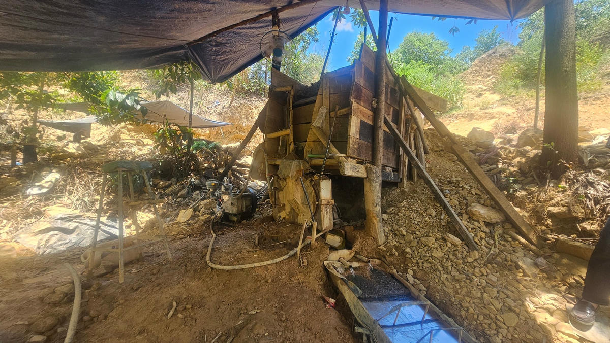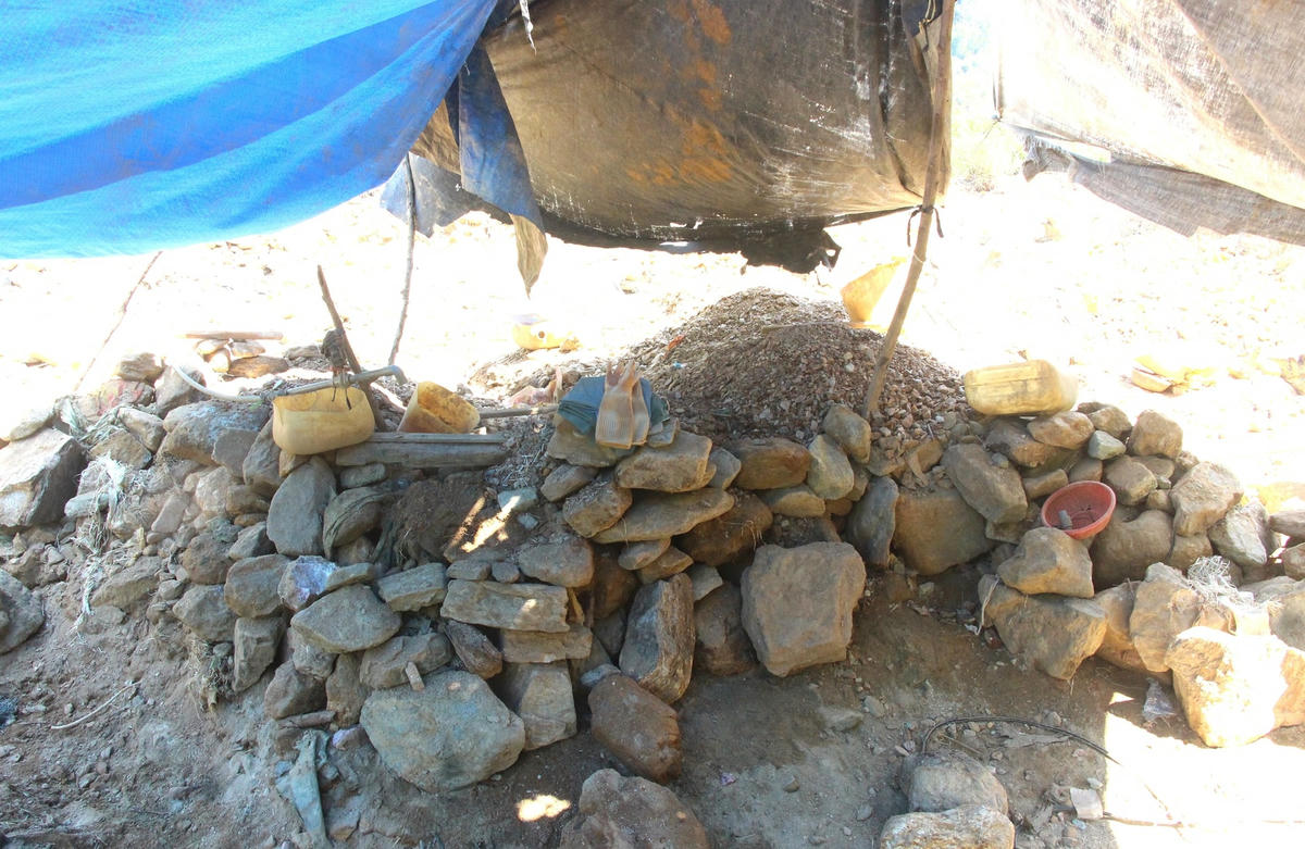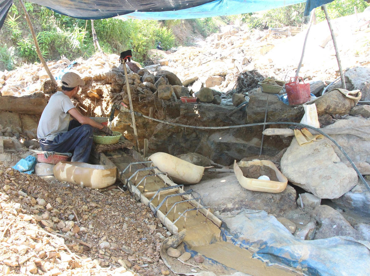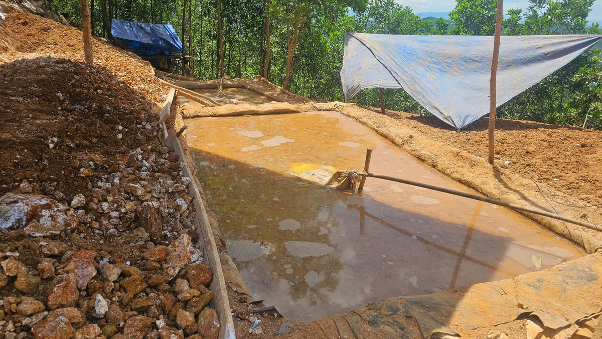 Đất đá trong hầm được chuyển ra, đưa vào máy xay nghiền nhỏ và dùng nước cho chảy qua máng để lọc lấy quặng vàng. Cách đó không xa, một nhóm người lấy đất đá lộ thiên trộn với hóa chất cho vào các bể ngâm ủ có đường kính 10m, được lót bạt xung quanh.