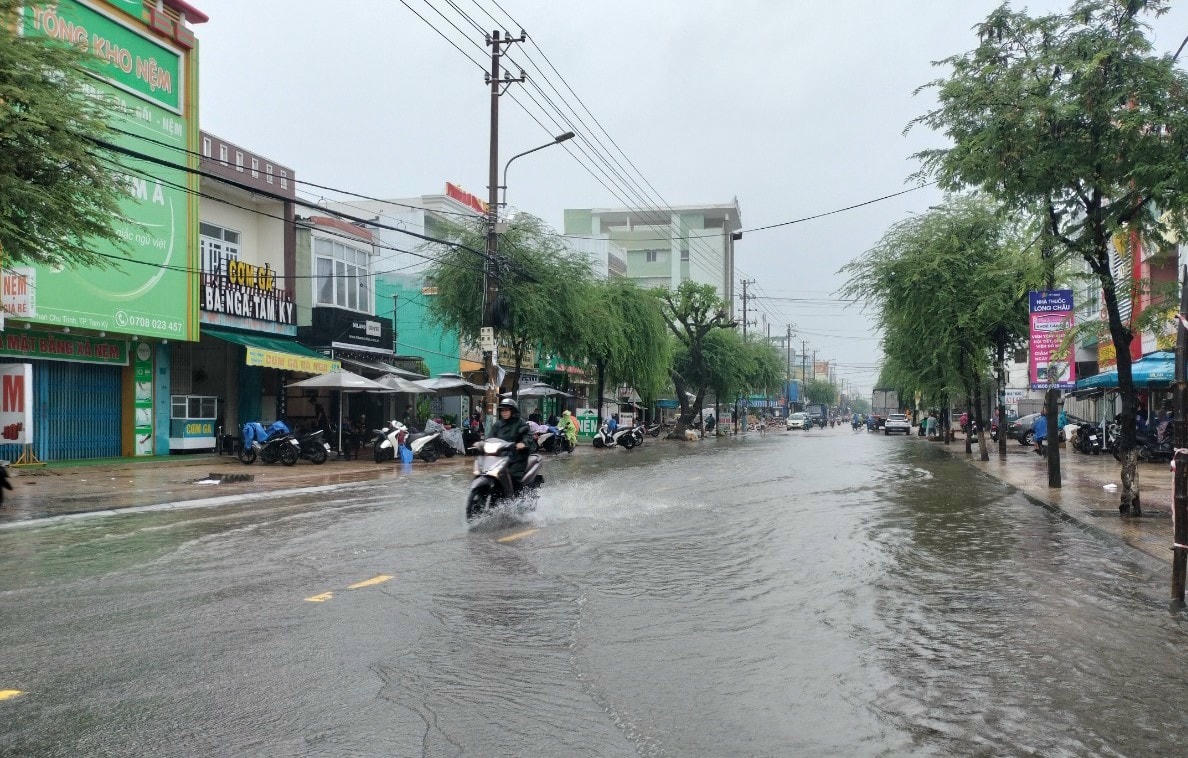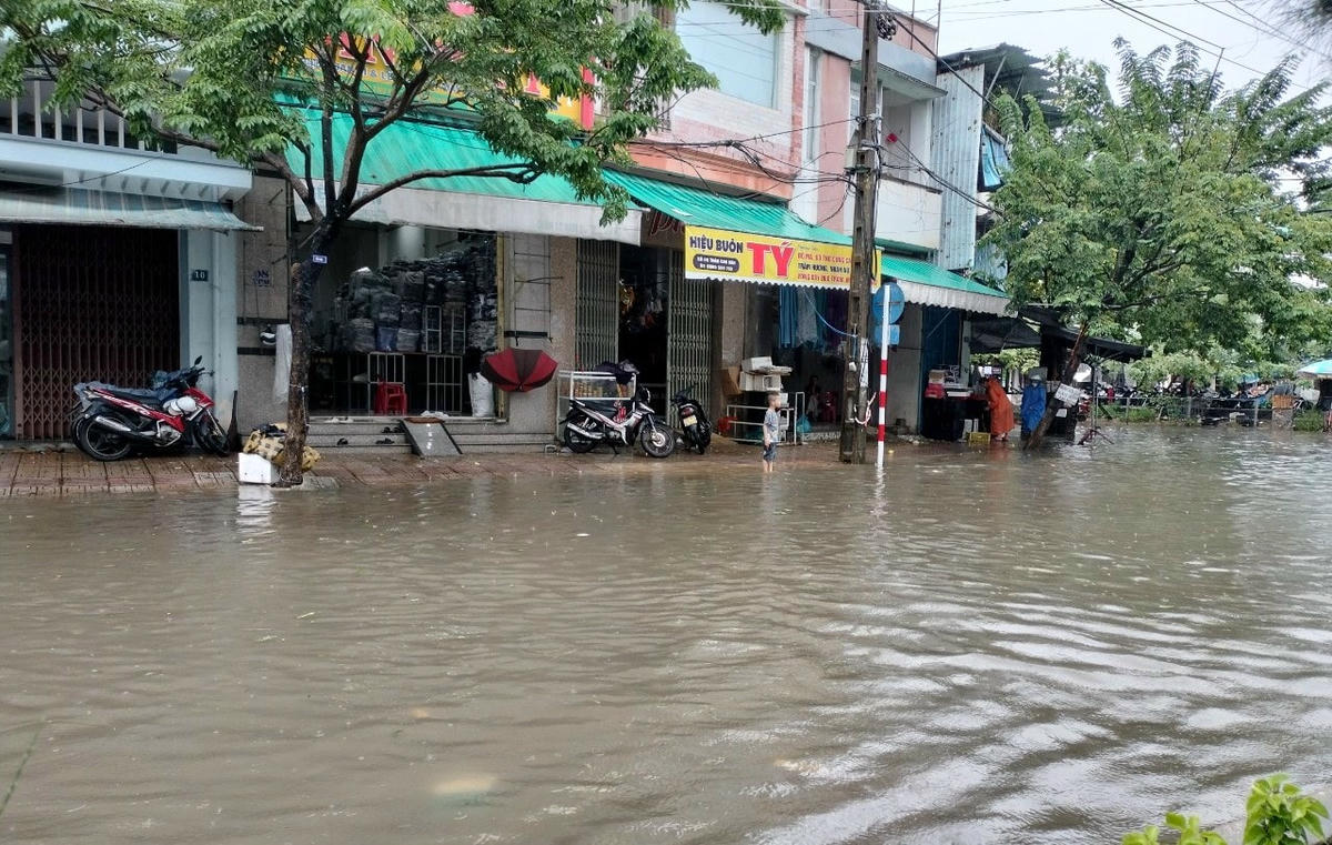 Mưa lớn từ tối 14 đến sáng 15/10, tại một số vùng thấp trũng ở TP Tam Kỳ và huyện Phú Ninh, tỉnh Quảng Nam bị ngập nước sâu, gây khó khăn cho phương tiện và người dân đi qua lại.