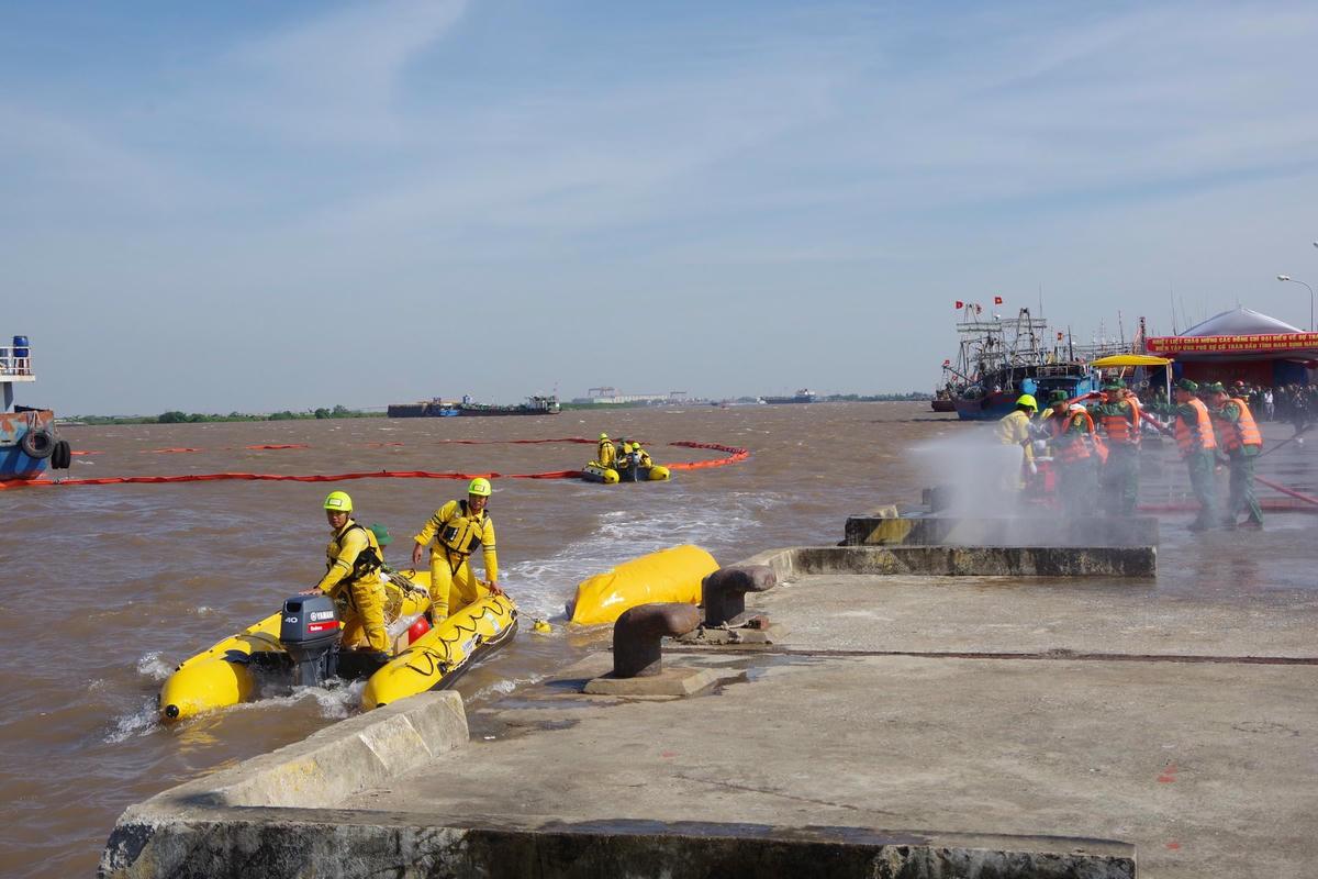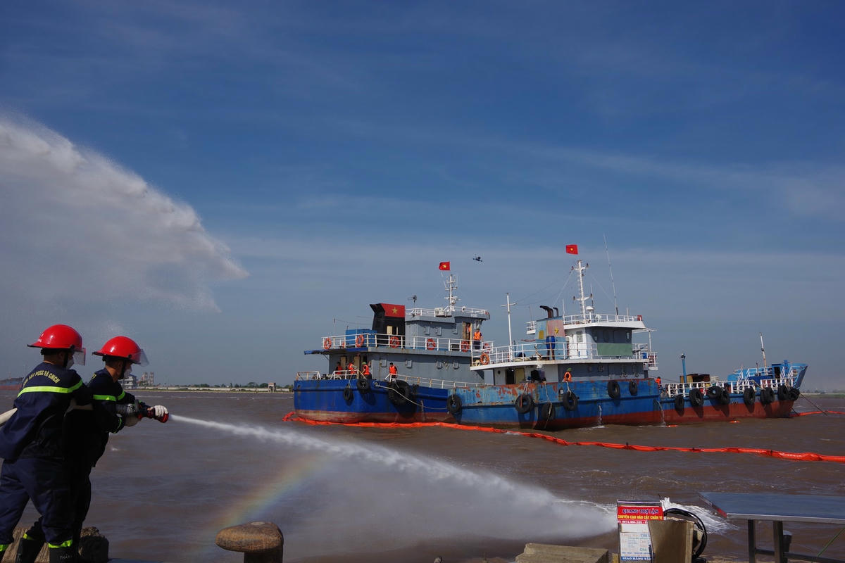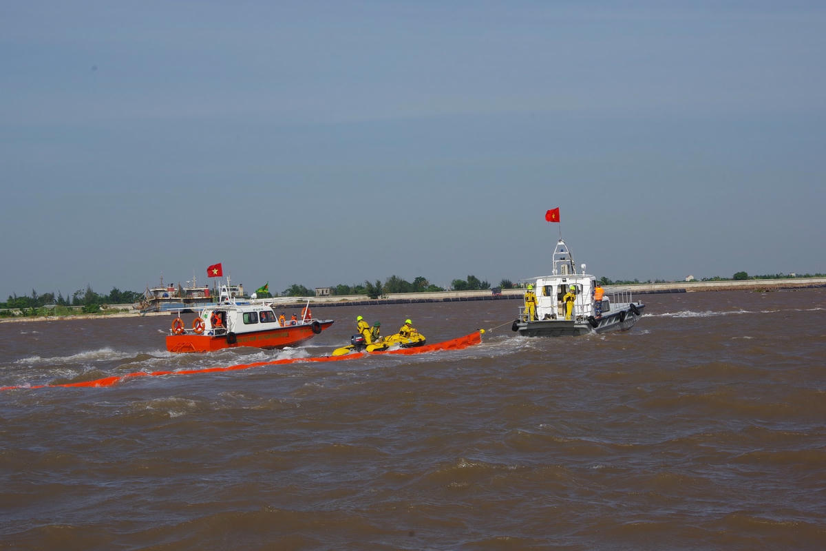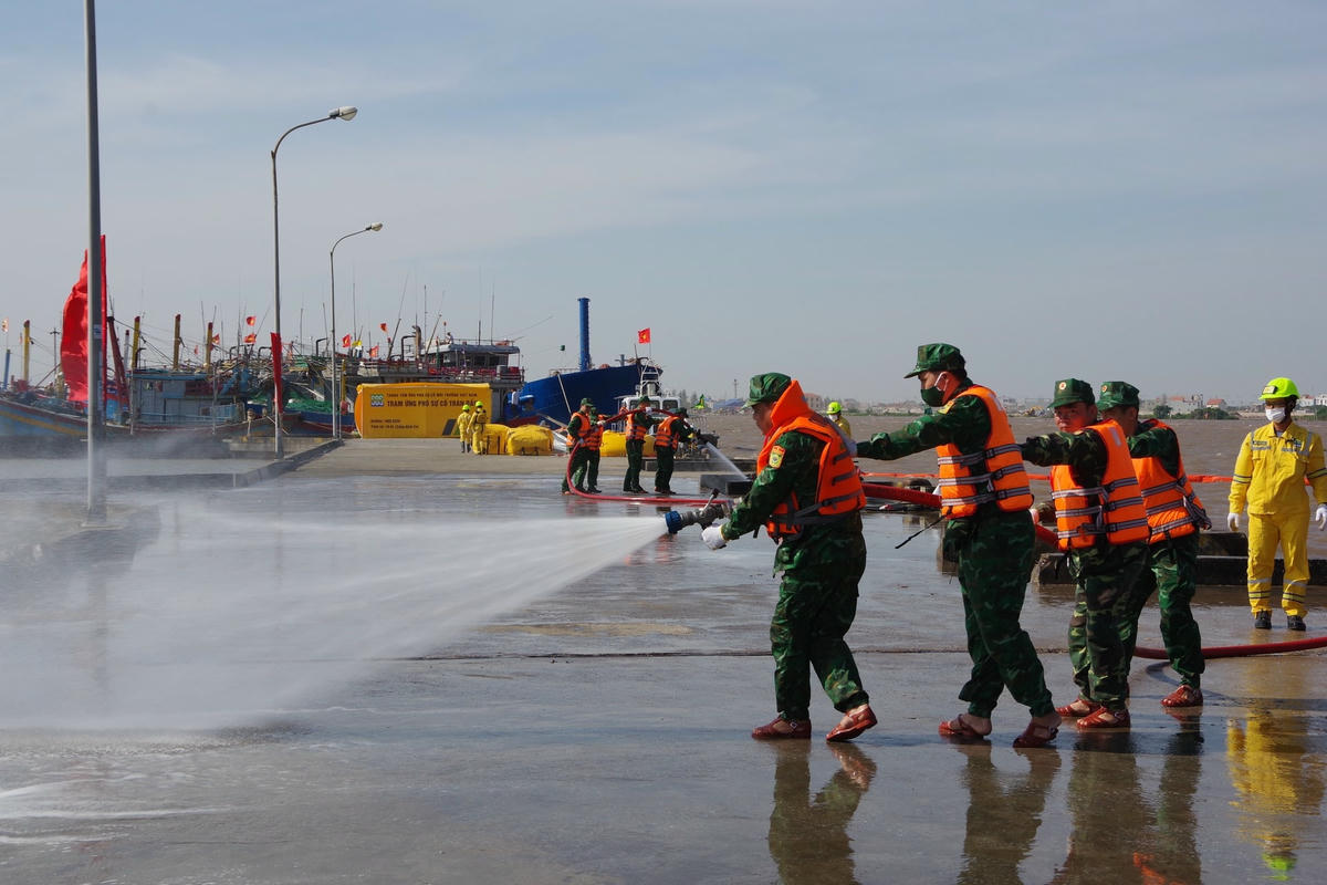 Đưa ra một tình huống giả định cụ thể một tàu chở dầu bị thủng vỏ, tràn dầu trên khu vực cửa sông, Nam Định huy động hơn 200 người thuộc nhiều lực lượng diễn tập cứng cứu…