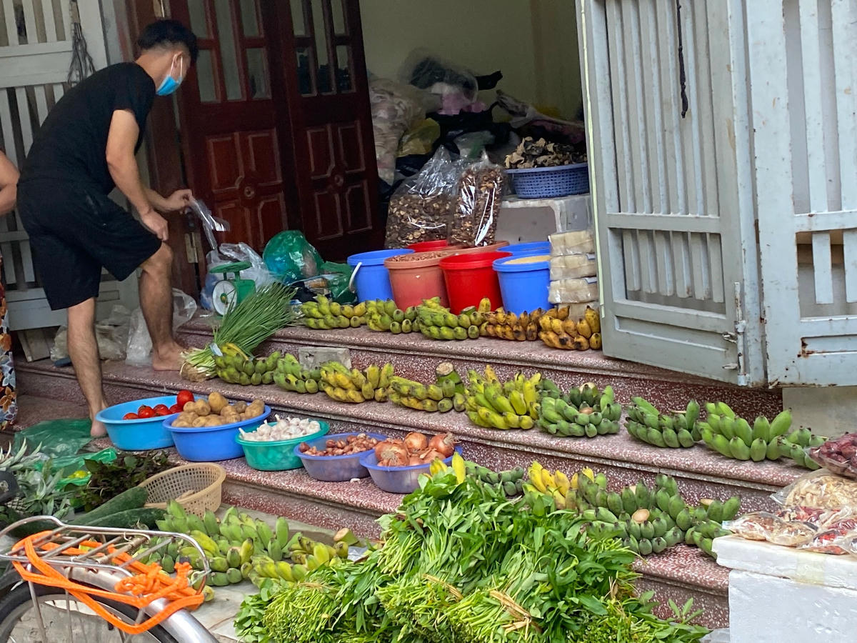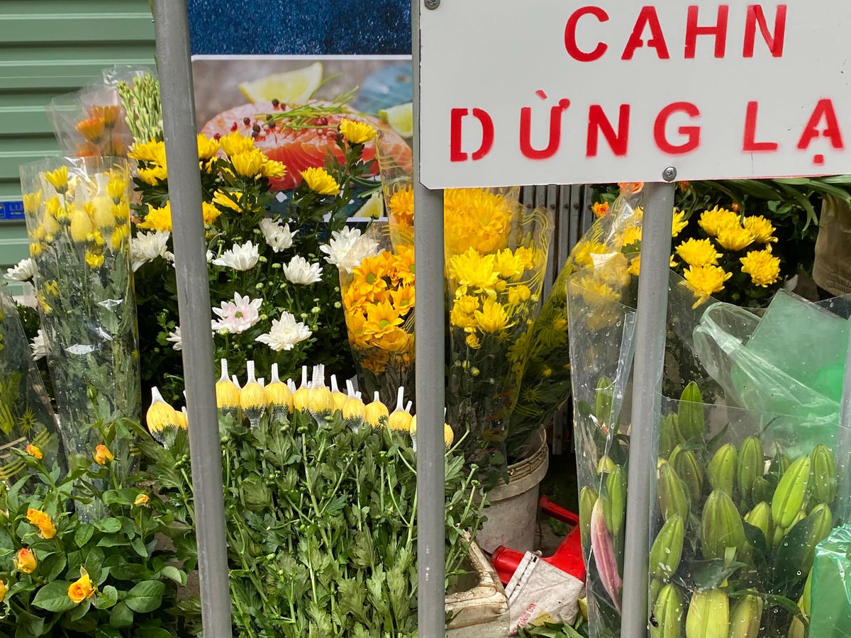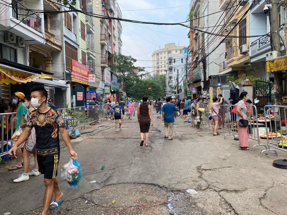 Tại khu chợ Dịch Vọng (quận Cầu Giấy), các hàng hoa đã được bán trở lại, vẫn đảm bảo giữ khoảng cách giữa khách hàng và người bán qua hàng rào. Tất cả người mua và ngừoi bán đều thực hiện nghiêm các quy định phòng, chống dịch Covid-19. Đặc biệt là việc tuân thủ đeo khẩu trang. Xôi, bánh chưng, giò chả được bày bán phục vụ nhu cầu của khách trong ngày rằm. Người dân để xe phía bên ngoài có lực lượng tổ dân phố hỗ trợ, đi bộ mua hàng trong chợ để đảm bảo trong việc chủ động giữ khoảng cách. Nhiều người bán hàng cẩn thận đeo hai khẩu trang. Người dân đi mua hàng đều có ý thức trong phòng, chống dịch. Một số cửa hàng phía bên ngoài khu chợ không dựng rào chắn nhưng thực hiện chăng dây để giữ khoảng cách với khách hàng. Tại khu chợ phố Hoa Bằng (quận Cầu Giấy), lực lượng tổ dân phố liên tục đi nhắc nhở người bán, người mua giữ khoảng cách. Những người bán hàng cũng được yêu cầu ngồi giãn cách. Hoa quả ngày rằm khá phong phú, đa dạng, người dân có thể thoải mái lựa chọn. Chị Thuỳ (làng hoa Tây Tựu) cho biết, hôm nay được đi bán hàng chị rất vui. Thời gian qua, nhiều lứa hoa đã buộc phải cắt bỏ do không đi bán, thực hiện giãn cách xã hội. Giá hoa cúc vào đúng ngày rằm vẫn ổn định, khoảng 40.000-50.000 đ/chục, không có tình trạng khan hàng, tăng giá.