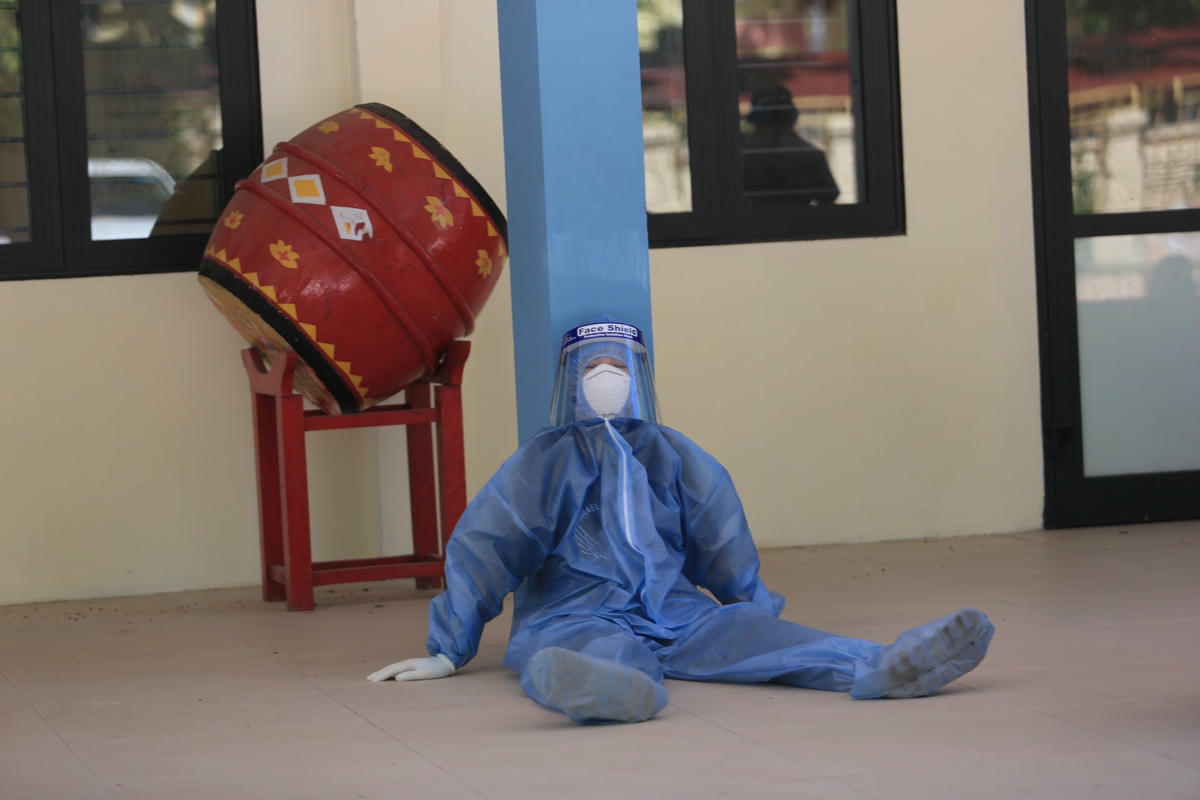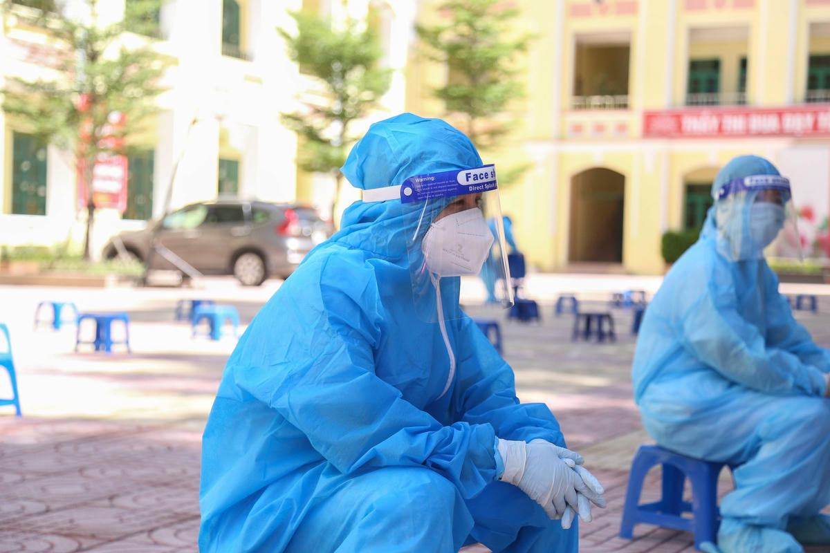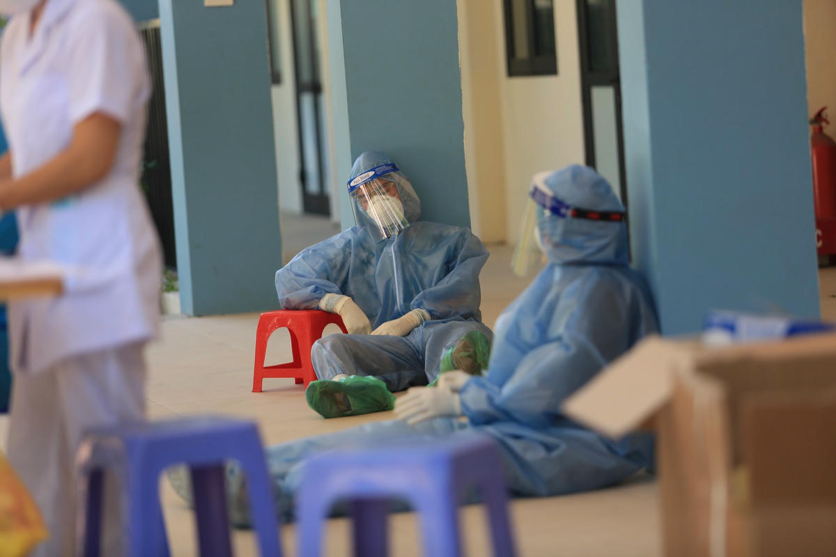 Trong bộ đồ bảo hộ kín mít làm việc dưới thời tiết nắng nóng, nhiều nhân viên y tế quận Đống Đa (Hà Nội) kiệt sức sau nhiều giờ lấy mẫu xét nghiệm Covid-19.
