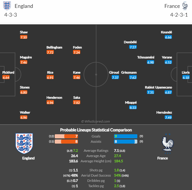 Là hai trong số những đội bóng ghi nhiều bàn nhất, sở hữu hàng công đắt giá nhất World Cup 2022, Anh và Pháp hứa hẹn tạo nên thế trận tấn công ăn miếng trả miếng. Người hâm mộ cũng lấy làm tiếc khi hai gã khổng lồ bóng đá châu Âu gặp nhau quá sớm.