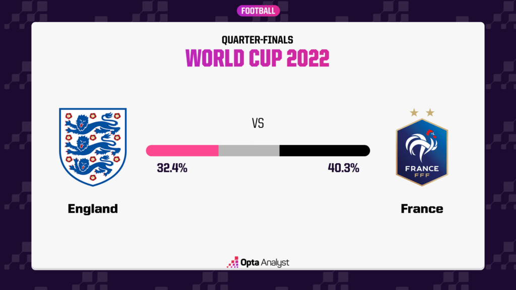 Khó lường là hai từ ngắn gọn nhất nói về kết quả trận đấu này, ngay cả dự đoán từ mô hình mô phỏng của siêu máy tính Opta cũng cho thấy sự sít sao. Pháp có 40,3% cơ hội chiến thắng, cao hơn một chút so với Anh, 32,4%. Trường hợp hai đội hòa sau 90 phút chiếm 27,3%.