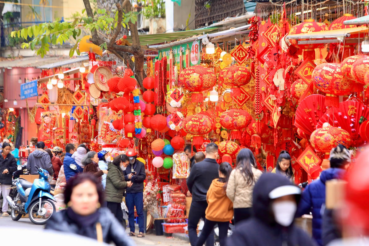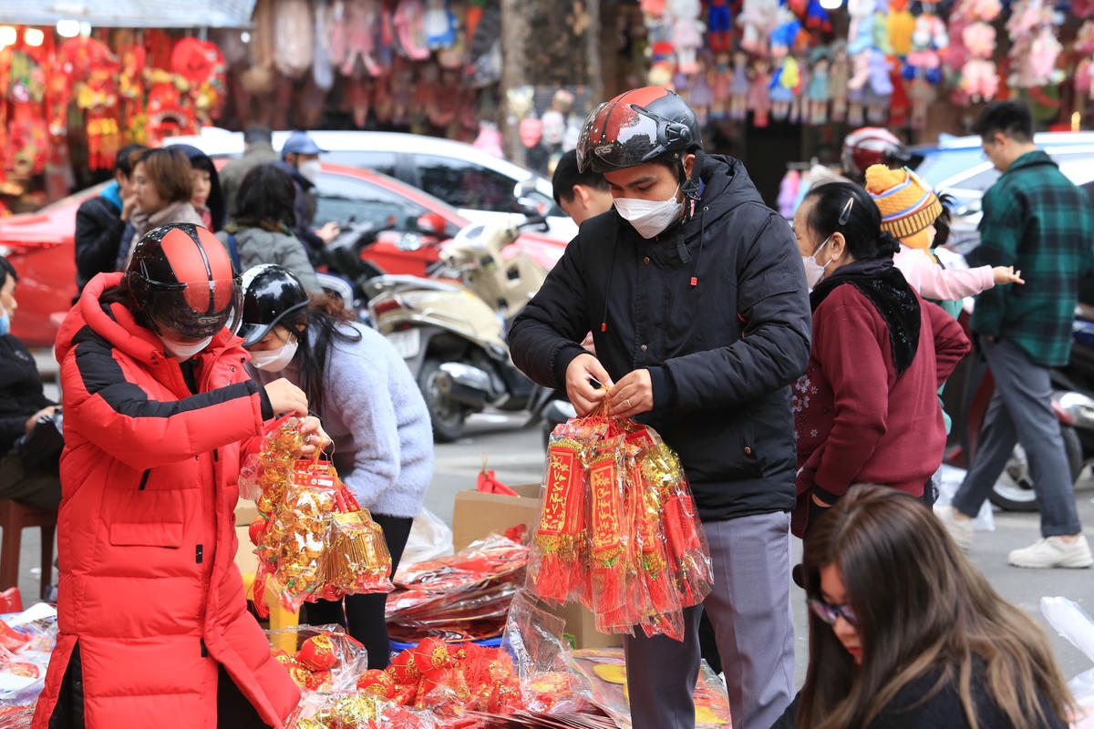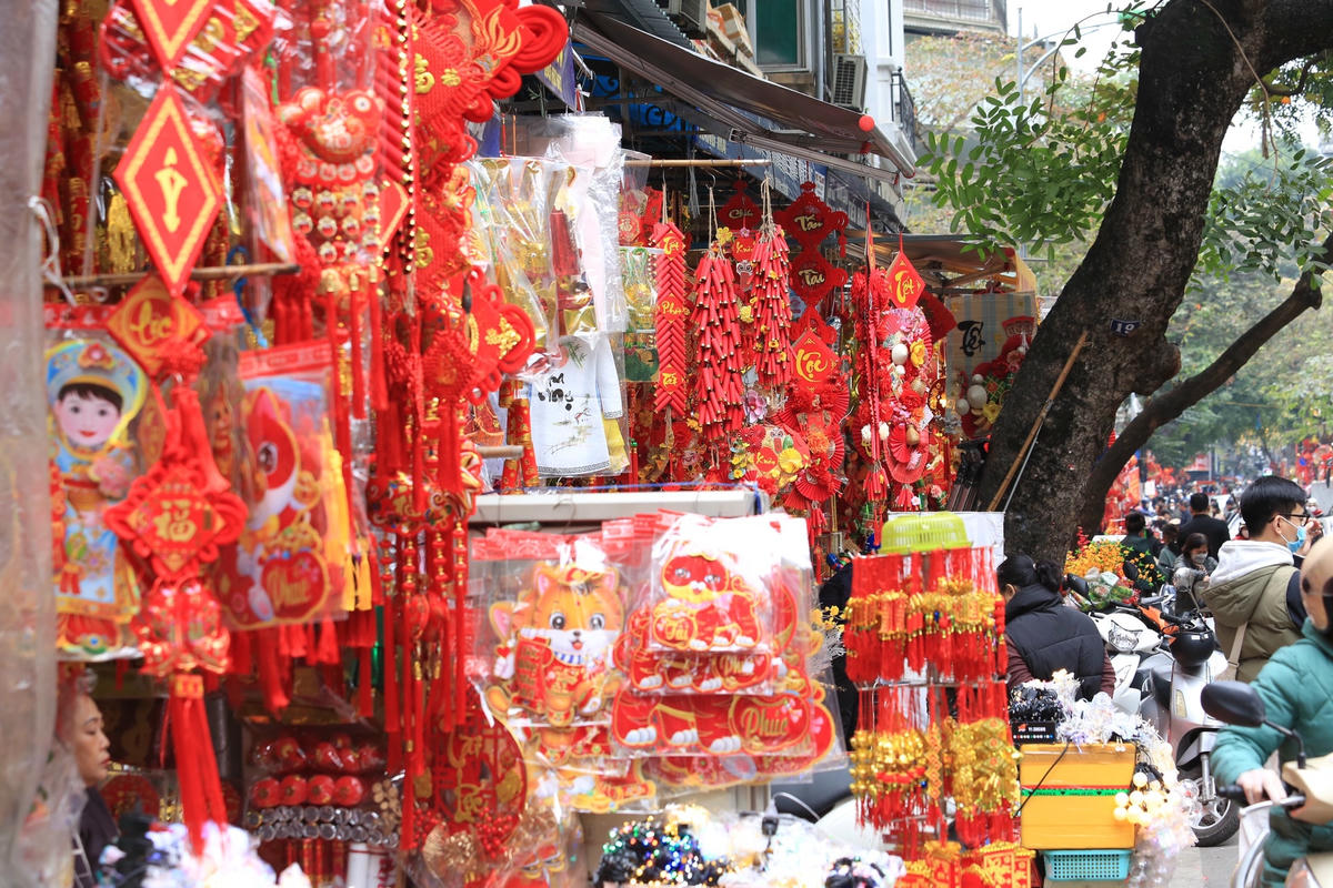 Mỗi dịp Tết đến Xuân về trên phố Hàng Mã lại ngập tràn sắc đỏ đặc trưng của ngày Tết. Đèn lồng, bao lì xì, pháo giấy, câu đối đỏ hay màu xanh của cặp bánh chưng... Tất cả tạo nên bức tranh đầy màu sắc ngập tràn không khí chào đón Tết Nguyên đán đang về.Theo ghi nhận của PV Báo Đại Đoàn Kết Online, dọc 2 bên phố Hàng Mã tràn ngập các mặt hàng phục vụ nhu cầu trang trí nhà cửa của người dân dịp Tết Nguyên đán.Năm nay các sản phẩm đồ trang trí, câu đối,... tại phố Hàng Mã có nhiều chủng loại để người dân dễ lựa chọn.Màu đỏ và vàng là hai sắc màu chủ đạo nổi bật nhất, tượng trưng cho sự may mắn, sung túc và thịnh vượng.Theo một chủ cửa hàng trên phố Hàng Mã chia sẻ, năm nay các sản phẩm trang trí nhà cửa dịp Tết có giá bán tương đối ổn định. Ví dụ dây trang trí nhỏ có giá từ 10.000 - 20.000 đồng/dây; các đồ trang trí có chữ “Chúc mừng năm mới”, “An khang thịnh vượng”… tùy kích cỡ lớn nhỏ mà có giá bán từ 120.000 - 250.000 đồng/sản phẩm.Tại phố Hàng Mã bày bán rất nhiều sản phẩm mang đậm truyền thống những ngày Tết của người Việt Nam.Các cửa hàng tại tuyến phố này luôn được đông đảo người dân tìm đến mua đồ.