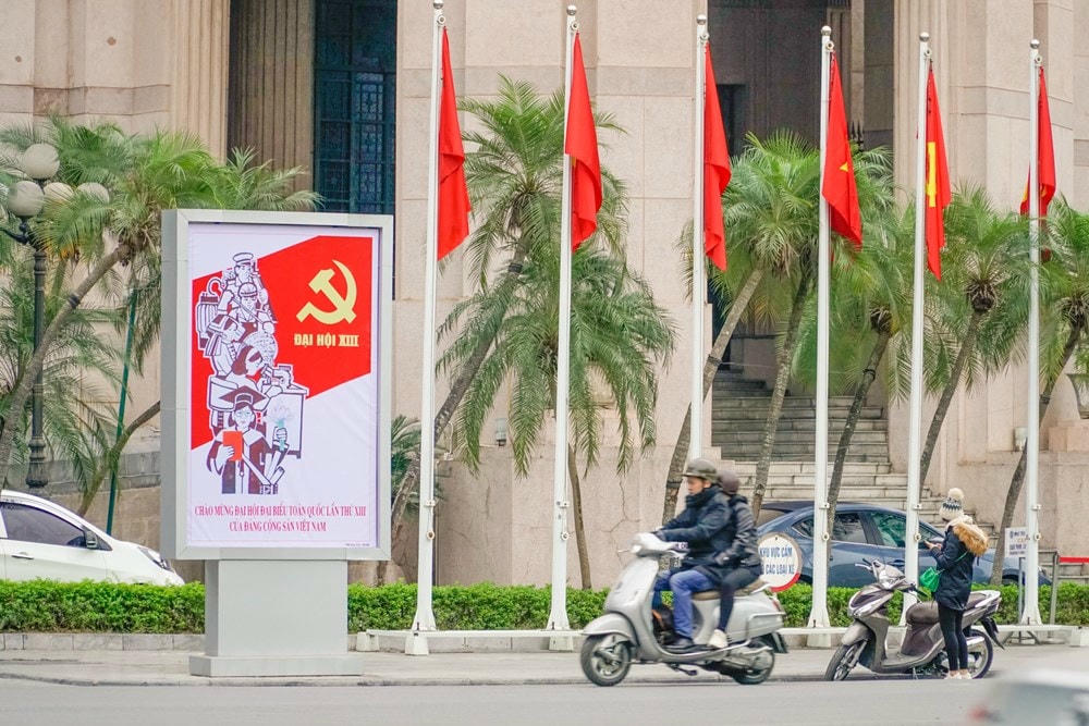 Các tuyến phố tại Hà Nội đã rực rỡ cờ đỏ sao vàng, áp phích, khẩu hiệu để chào mừng Đại hội đại biểu toàn quốc lần thứ 13 của Đảng.