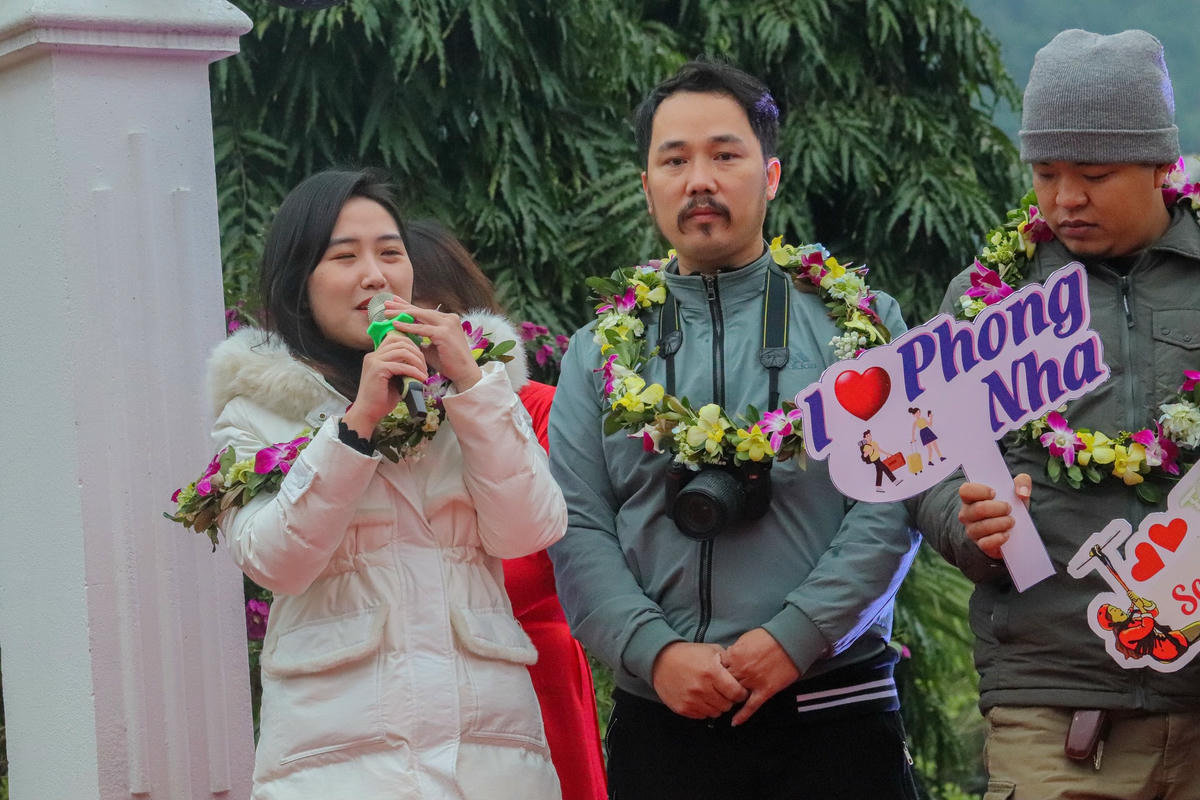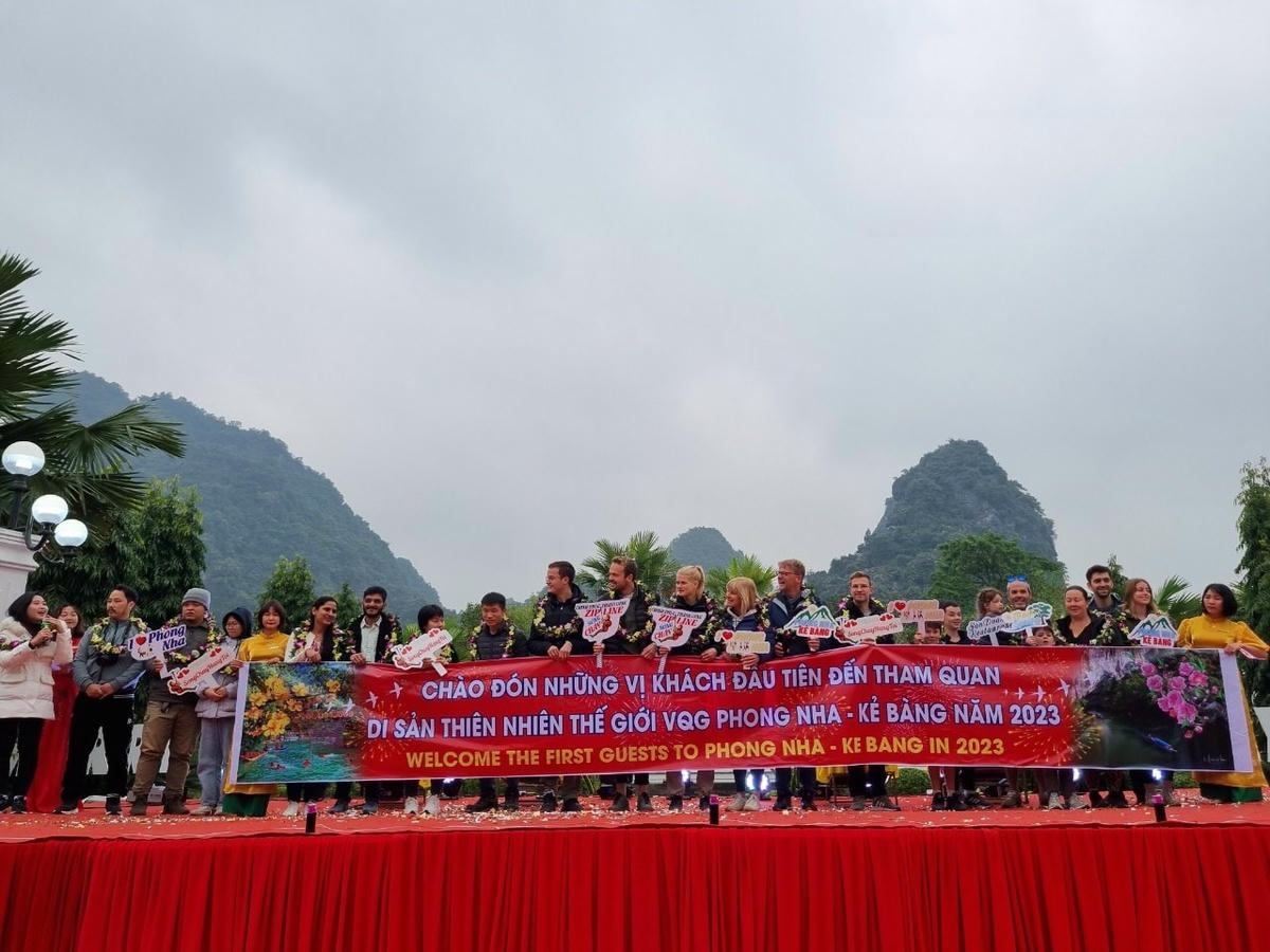 Trong ngày đầu tiên của năm mới 2023, Ban Quản lý Vườn Quốc gia (VQG) Phong Nha – Kẻ Bàng tổ chức đón, tặng hoa chào mừng cũng như lì xì 45 vị khách đầu tiên đến xông đất Di sản Thiên nhiên thế giới.Chương trình đón vị khách đầu tiên nằm trong chuỗi chương trình kích cầu du lịch Quảng Bình năm 2023 và tổng kết những nỗ lực, cố gắng để phục hồi và tăng trưởng ngành du lịch Quảng Bình.Du khách nước ngoài hào hứng khi được Ban Quản lý Vườn Quốc gia (VQG) Phong Nha – Kẻ Bàng đón tiếp chu đáo trong ngày đầu tiên đón năm mới.Những vị khách đặc biệt này được miễn phí vé tham quan động Phong Nha vào ngày đầu tiên của năm 2023.Chương trình đón những vị khách đầu tiên đến với Phong Nha – Kẻ Bàng là một trong những hoạt động mở đầu cho chuỗi các sự kiện quảng bá hình ảnh, xúc tiến du lịch trên toàn tỉnh Quảng Bình. Đồng thời, là dịp thể hiện tình cảm mến khách, tạo môi trường thân thiện, điểm đến hấp dẫn, an toàn đối với du khách trong nước và quốc tế khi đến với Phong Nha – Kẻ Bàng nói riêng và tỉnh Quảng Bình nói chung, là sự khởi đầu cho những nỗ lực, quyết tâm phục hồi hoạt động du lịch, kỳ vọng một năm mới khởi sắc.Chia sẻ về chuyến đi đặc biệt của mình, chị Kiều Anh đến từ Nam Định cho biết: “Sau khi tìm hiểu về các địa điểm tham quan du lịch trong ngày đầu năm, tôi chọn Phong Nha – Kẻ Bàng là điểm đến bởi vì nơi đây có cảnh quan đẹp, con người hiền hậu và đặc biệt là sự tiếp đón nhiệt tình, chu đáo của các cán bộ nhân viên tại đây. Tôi rất vui khi là một trong những thành viên đặt chân “xông đất” cho du lịch Phong Nha – Kẻ Bàng trong ngày đầu năm 2023”.Theo Sở Du lịch Quảng Bình, tổng lượng khách du lịch đến Quảng Bình năm 2022 dự ước đạt hơn 2 triệu lượt khách, đạt 100,5% so với kế hoạch năm 2022. Tổng thu từ khách du lịch dự ước đạt hơn 2.300 tỷ đồng, đạt 102,8% so với kế hoạch năm 2022.Năm 2023, du lịch Quảng Bình đặt mục tiêu đón từ 3-3,5 triệu lượt khách. Trong đó, có 100 nghìn lượt khách quốc tế. Tổng thu từ khách du lịch đạt 3.400-3.900 tỷ đồng. Trước đó, đêm 31/12/2022, tại Phong Nha - Kẻ Bàng cũng diễn ra chương trình đếm ngược chào đón năm mới (Phong Nha Countdown Party 2023). Chương trình được phát trực tuyến trên các nền tảng số của du lịch Quảng Bình (chính thức tại Fanpage Facebook: QuangBinh Tourism) thu hút hàng vạn người theo dõi.