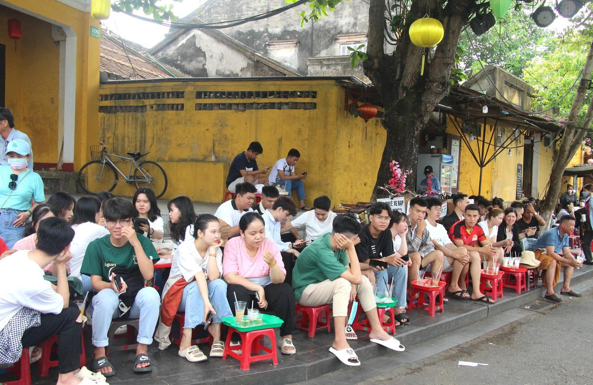 Bên cạnh đó, nhiều cửa hàng quán cà phê, nước giải khát ở phố cổ Hội An cũng đông nghịt du khách ngồi ăn uống, trò chuyện.