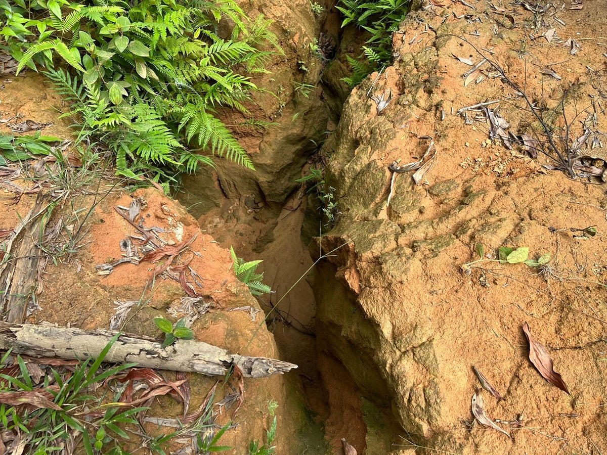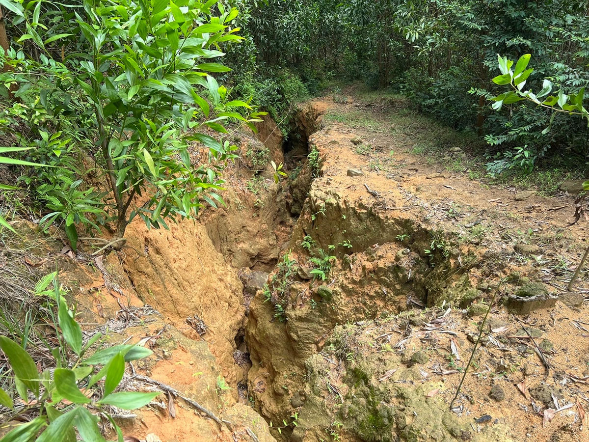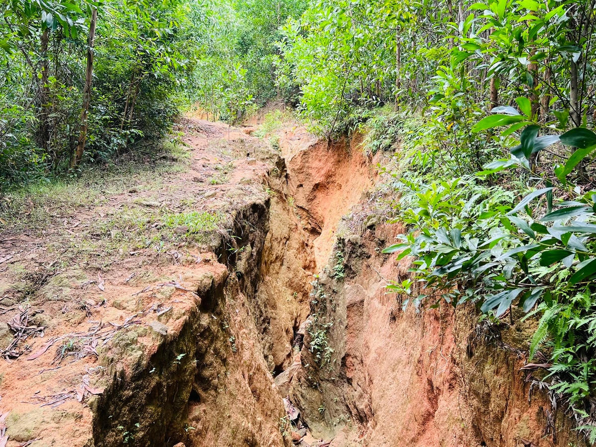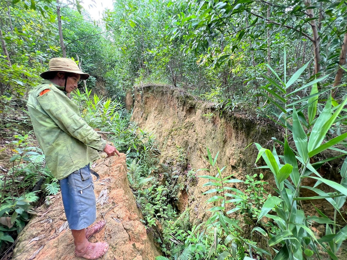 Ông Phạm Văn Lem, ở trú tổ 3, thôn Nước Lăng cho hay, cách đây gần 4 năm núi Cà Mon đã xuất hiện 3 vết nứt lớn, hiện các vết nứt ngày càng dài ra và rộng thêm, có chỗ vết nứt kéo dài cả chục mét. Mỗi khi vào mùa mưa bão nguy cơ sạt lở núi rất cao.