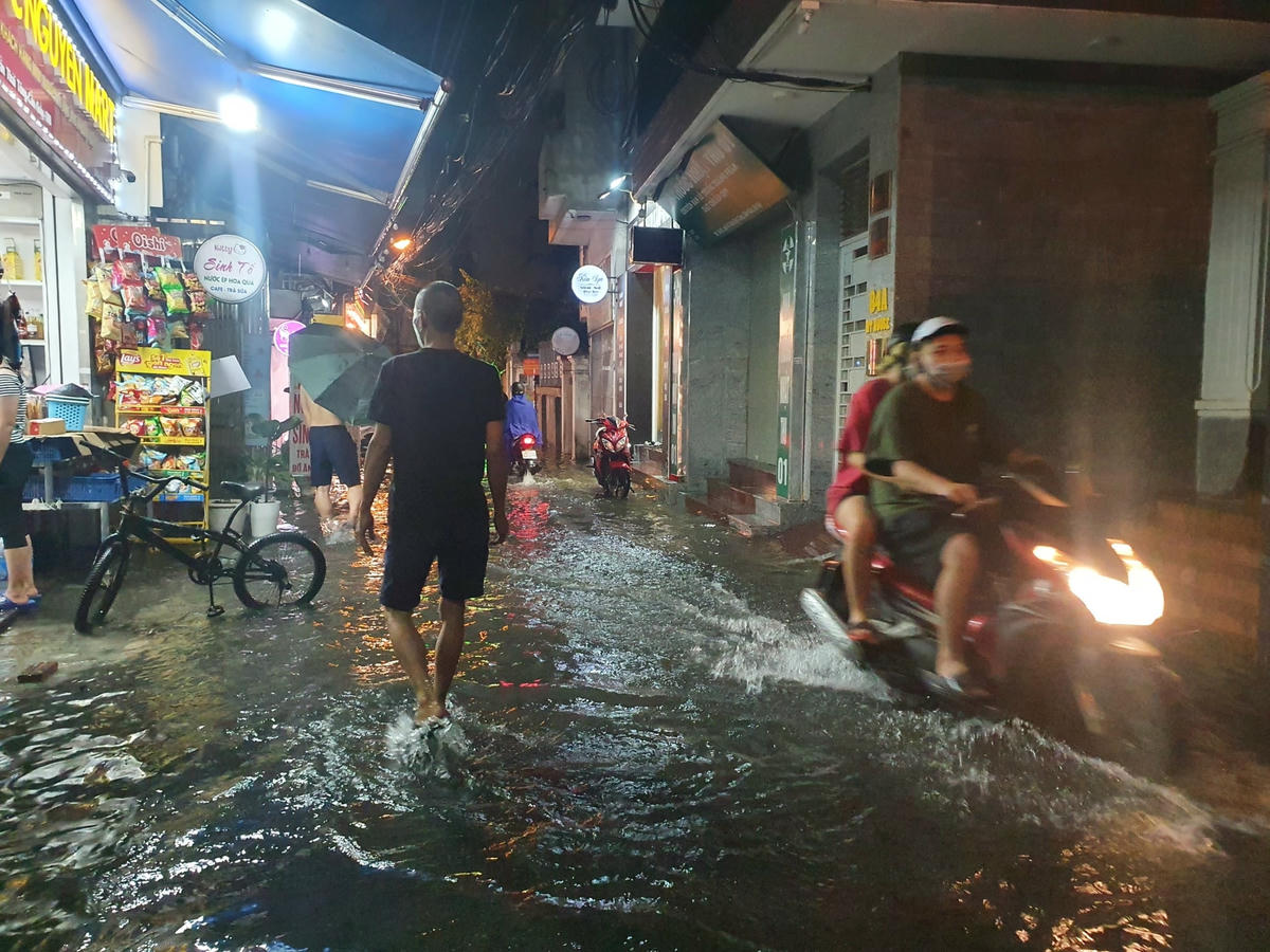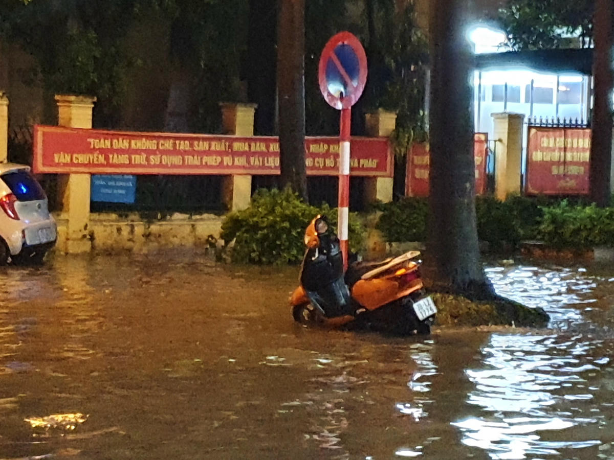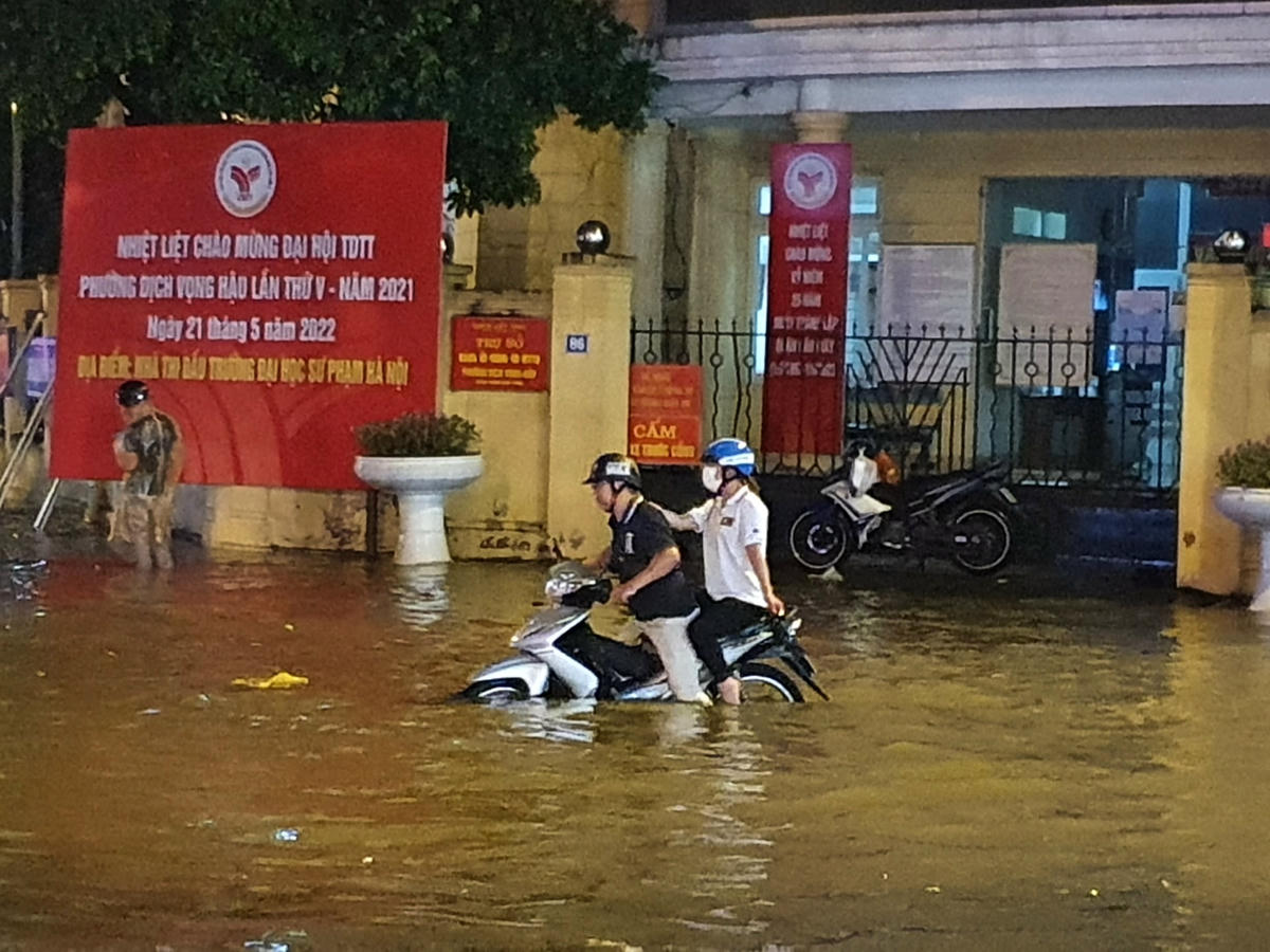 Cơn mưa như trút nước vào khoảng 20h tối nay (13/6) đã làm cho nhiều tuyến đường của Hà Nội tiếp tục ngập sâu. Người và xe bì bõm dưới làn nước.Ghi nhận của PV, đường Trần Thái Tông nhiều đoạn nước ngập cả bánh xe máy. Các phương tiện không thể di chuyển, nối đuôi nhau dắt xe cho khỏi chết máy.Trông con đường không khác gì sông...Hầm để xe của một toà nhà cũng ngập trong nước mưa.Tương tư, đường Cầu Giấy cũng ngập sâu một đoạn dài, nhiều phương tiện cố tình di chuyển đã chết máy.Hàng trăm người dân tập trung trên vỉa hè đợi nước cạn để di chuyển, trong khi lượng phương tiện đổ về ngày càng nhiều khiến con đường này trở nên ùn tắc nghiêm trọng.Cảnh các phương tiện ken cứng trên đường, tranh nhau từng mét di chuyển.Cách đó không xa, đoạn đường Xuân Thuỷ cũng ngập sâu quá đầu gối, cá biệt có đoạn từ Đại học Sư phạm đến Đại học Quốc gia Hà Nội, nước ngập đến đùi người lớn khiến giao thông ùn tắc cục bộ.Các phương tiện leo lên vỉa hè càng khiến tình trạng ùn tắc trở nên nghiêm trọng. Trong khi quay đầu di chuyển lại đường Cầu Giấy cũng gặp cảnh tắc tương tự khiến người dân rơi vào trạng thái tiến thoái lưỡng nan.Nhiều phương tiện phải dắt bộ do chết máy.Hàng loạt ngõ nhõ cũng ngập quá đầu gối.Đường Tràng Tiền cũng ngập sâu trong biển nước. Ảnh: Page Hà NộiNhìn ảnh này, nhiều người không còn nhận ra con đường quanh Tràng Tiền Plaza quen thuộc. Ảnh: Page Hà Nội