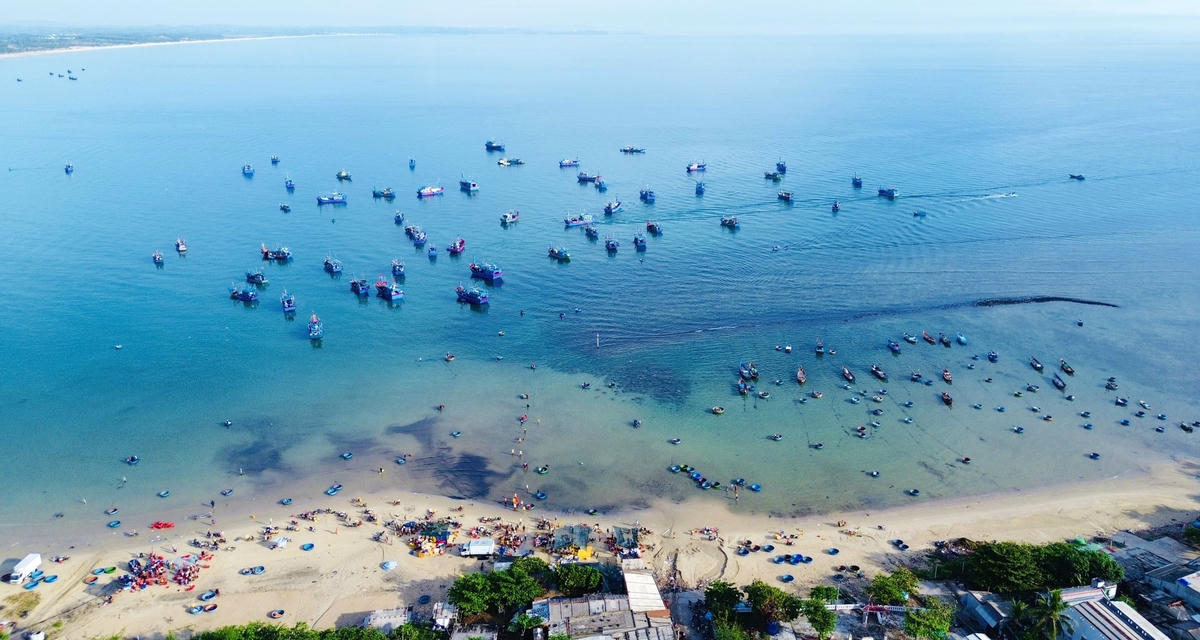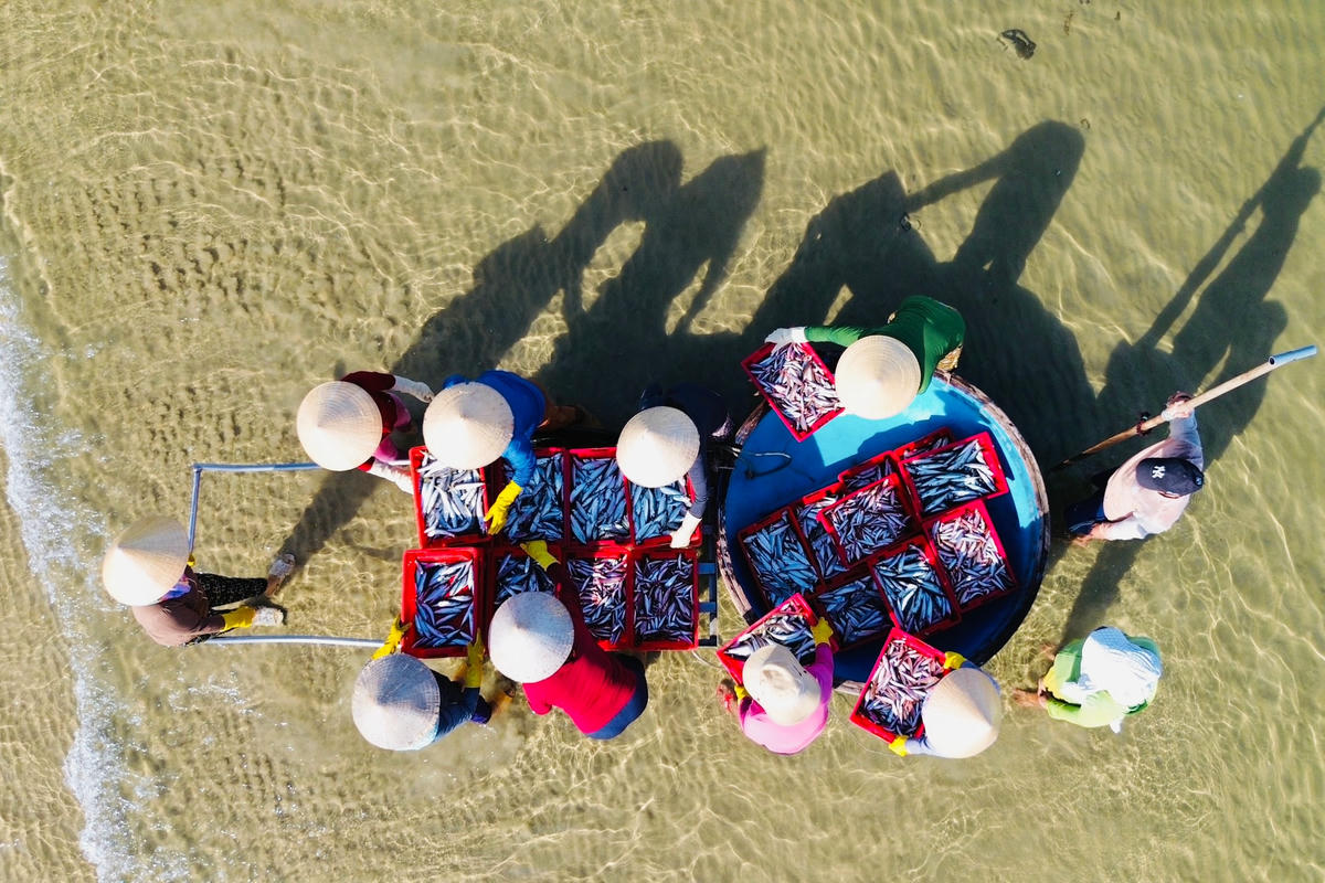 Tàu cá xuất bến từ hôm trước và đánh bắt xuyên đêm đến hôm sau thì quay về bờ bán hải sản. Để đưa hải sản vào bờ, ngư dân sẽ chuyển hải sản từ tàu lớn sang thuyền thúng nhỏ, còn tiểu thương chờ đợi sẵn trên bờ biển để thu mua. Việc thu mua cá diễn ra ngay bên bờ biển.
