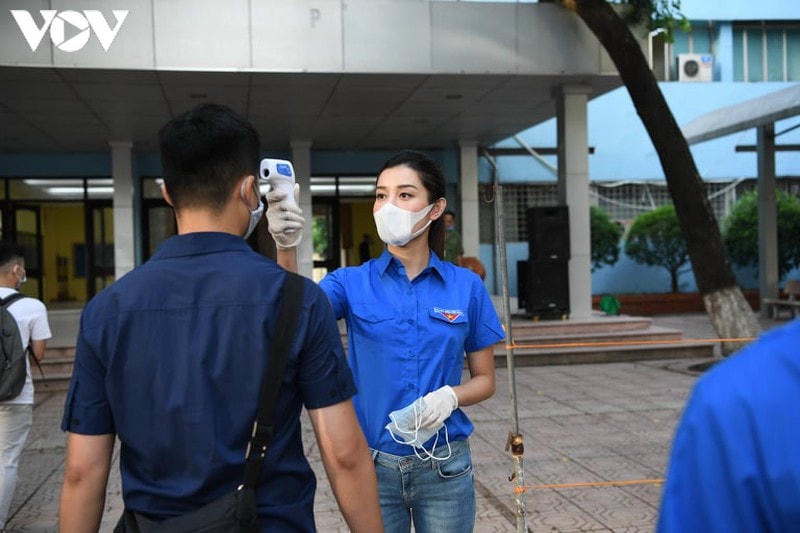 Bên ngoài các điểm thi, lực lượng y tế, thanh niên tình nguyện luôn sẵn sàng tiếp sức, hỗ trợ thí sinh trong bối cảnh dịch Covid-19 phức tạp.