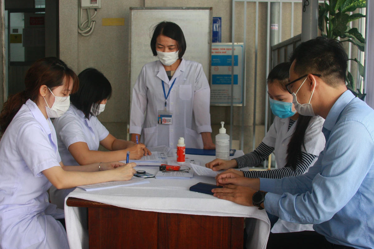 7h sáng, tại bàn hướng dẫn tiêm vaccine Covid-19, các nhân viên y tế của CDC Thừa Thiên - Huế đã có mặt tại Trung tâm để hướng dẫn những đối tượng tiêm chủng làm các thủ tục cần thiết để được tiêm vaccine Covid-19.