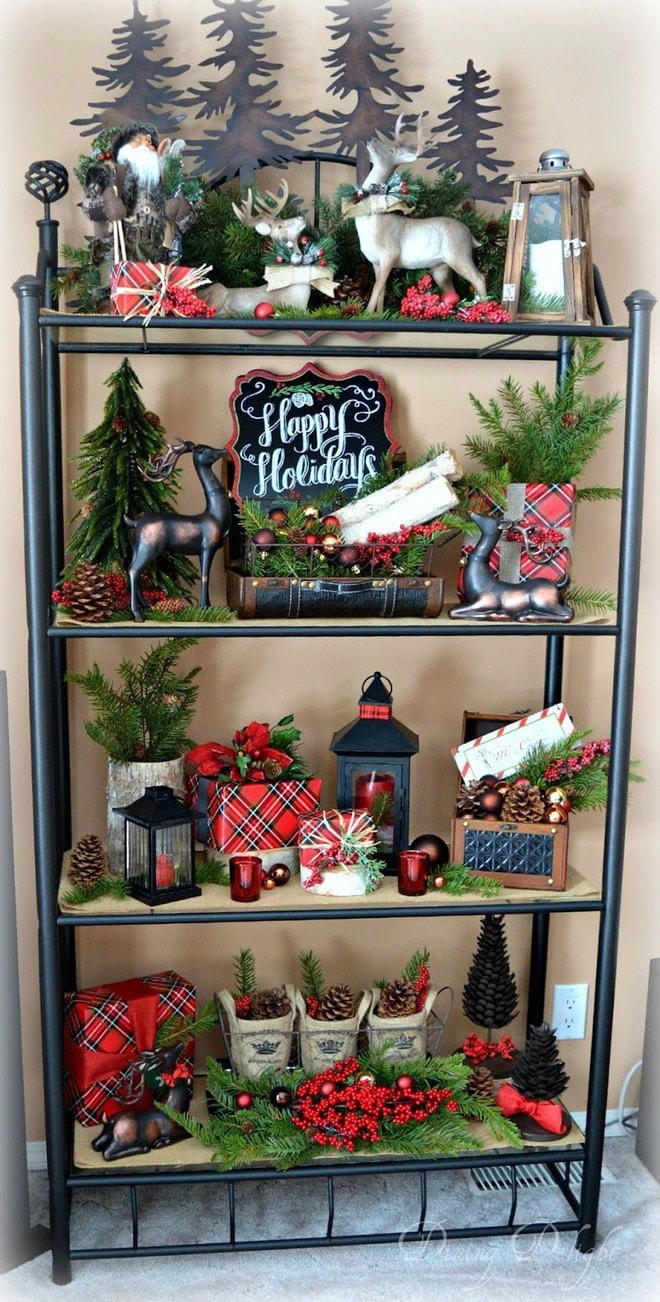 Làm mới kệ lưu trữ phòng khách bằng những phụ kiện trang trí Noel, vật dụng liên quan đến lễ hội.