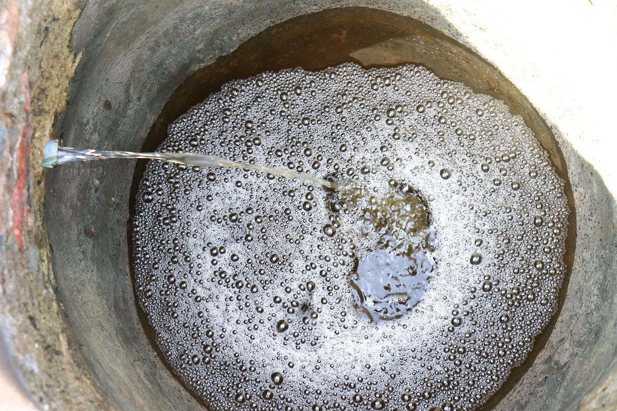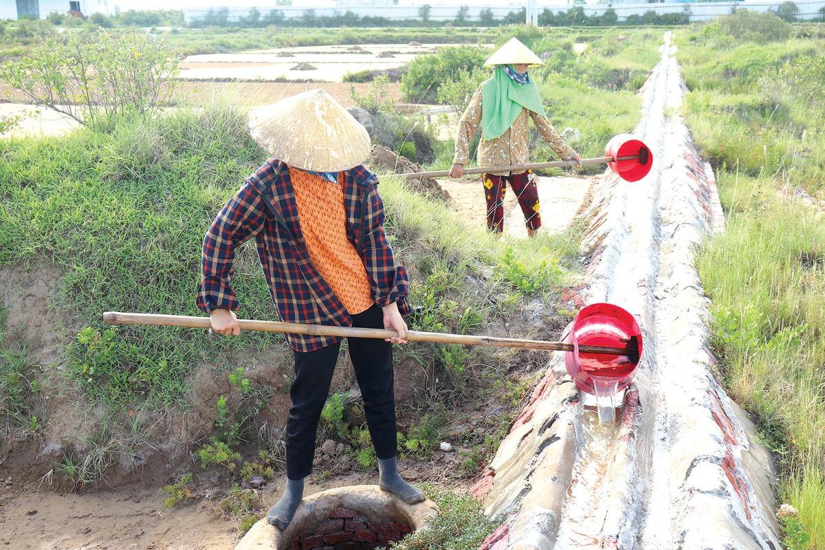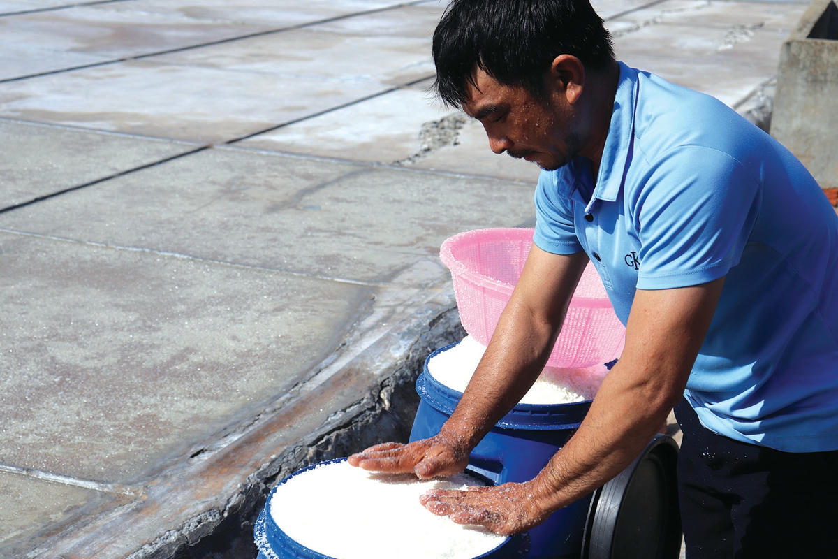 Bà Dung tiếp tục múc nước trong chum đổ vào một cái rãnh được xây bằng bê tông. Từ rãnh nhỏ, nước sẽ chảy vào một chiếc chum lớn hơn đặt ở gần sân phơi muối. Sau đó, nước sẽ được lắng lọc từ buổi chiều cho đến qua đêm, đến sáng thì đóng váng cặn ở đáy. Vào khoảng 7h sáng hôm sau, khi nắng lên, diêm dân múc nước ở chum này rải lên các ô bê tông.