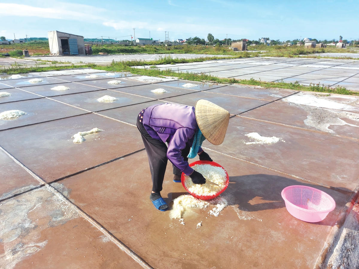 Sau gần 10 tiếng phơi nắng, nước sẽ bốc hơi, tạo ra muối để bà con thu hoạch vào buổi chiều. Theo chia sẻ của một số hộ dân, năng suất trung bình làm muối trong 1 ngày của họ đạt khoảng 200kg. Thương lái thu mua muối ngay tại ruộng với mức giá 2.400 đồng/kg, mang về thu nhập cho mỗi công lao động khoảng 250 nghìn đồng.