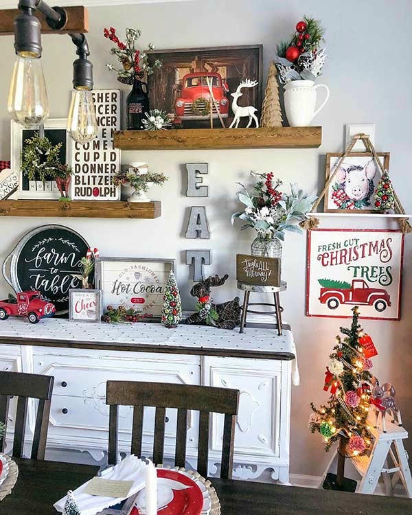 Không chỉ một mà bạn có thể trưng bày nhiều cây thông cỡ nhỏ trong cùng phạm vi. Cách trang trí Giáng sinh này hứa hẹn đem lại sự bắt mắt tươi vui. Đồng thời, bạn cũng khéo tạo ra không gian lưu trữ gây ấn tượng với khách khứa khi đến chơi nhà mùa lễ hội.