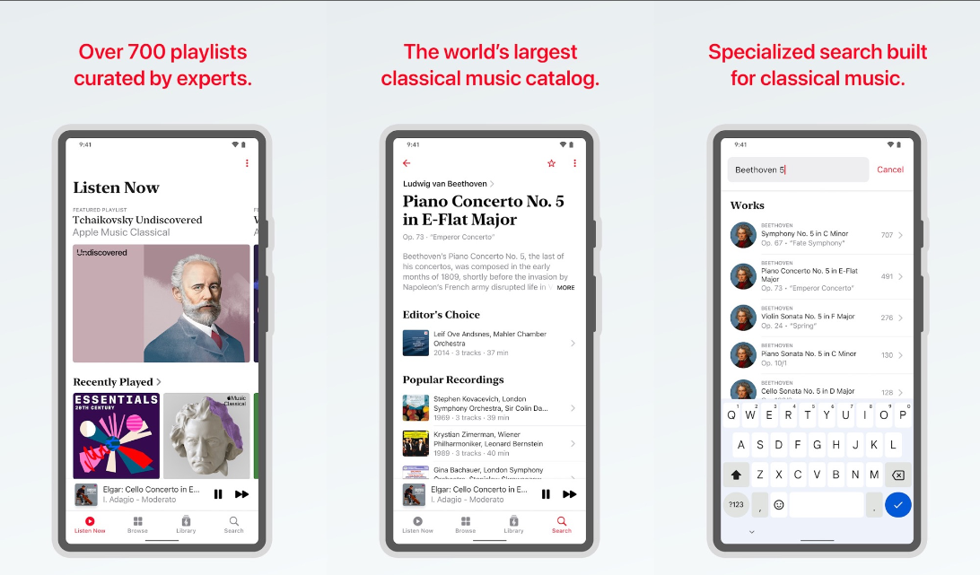 Đến lúc này, Apple Music Classical nằm trong danh sách các ứng dụng của cửa hàng Google Play, và nó có sẵn cho những người có tài khoản Apple Music hoặc Apple One. Thông qua việc này, người dùng Android có thể phát nhạc cổ điển với những tính năng như âm thanh lossless, âm thanh không gian và Dolby Atmos với một thư viện thưa thớt bao gồm các tác phẩm kinh điển của Beethoven, Mozart,...