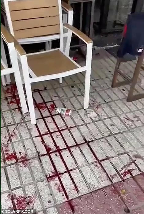 Máu vương vãi trên hè phố khi nhiều CĐV bị thương trong vụ việc.