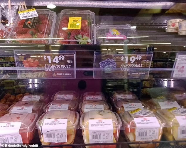 Một bức ảnh khác cho thấy giá của 250 g dâu tây (khoảng 9 quả) có giá 11.99 AUD Australia (tương đương 249.000 VNĐ) và 19.95 AUD Australia (332.000 VNĐ) cho 125 g quả việt quất.