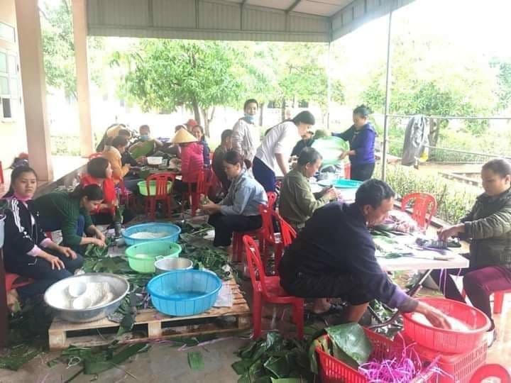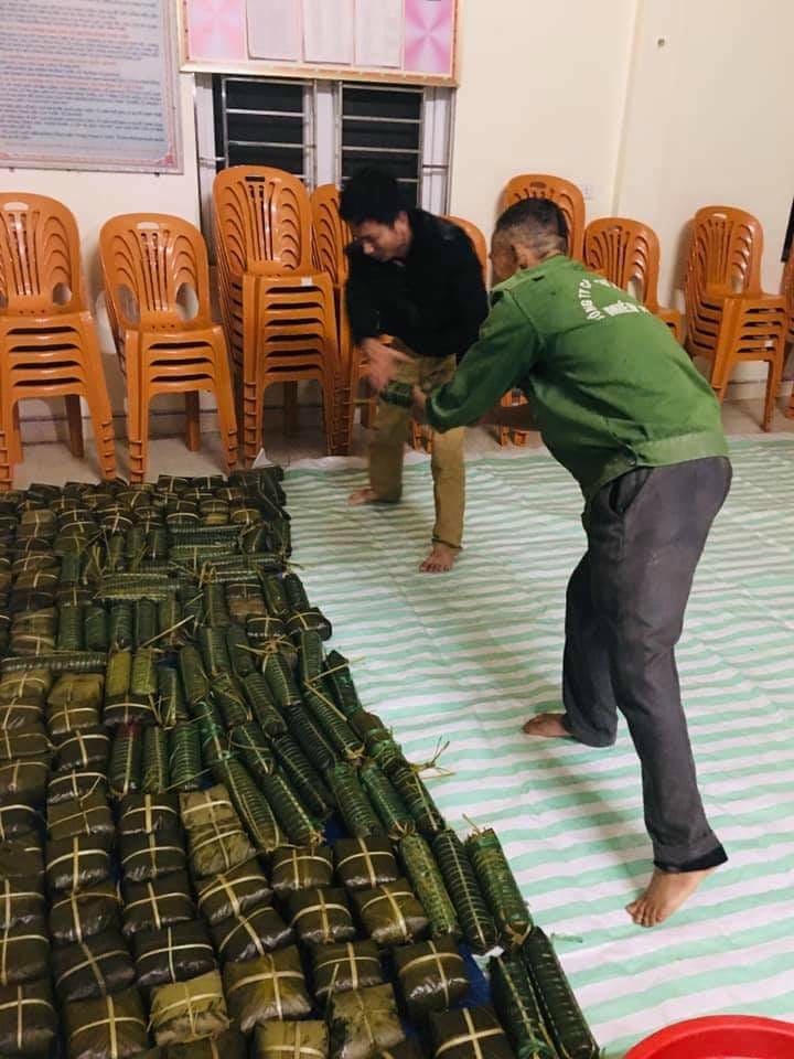 Sau 1 thời gian ngắn kêu gọi, bà con trong xóm đã quyên góp được gần 5 tạ gạo nếp, 5 yến đậu, nhiều lá chuối. Khoảng 60 - 70 người dân trong xóm đã tham gia các công đoạn làm bánh từ chẻ giang, lau lá, vo nếp, gói bánh, thức đêm nấu bánh…