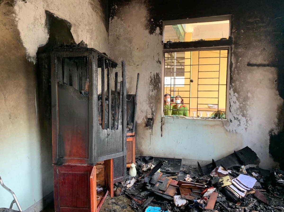 Tại hiện trường, chiếc tủ và bàn làm việc của Chủ tịch xã Diễn Nguyên bị cháy nham nhở. Trong phòng làm việc có nhiều giấy tờ cũng bị lửa thiêu cháy.