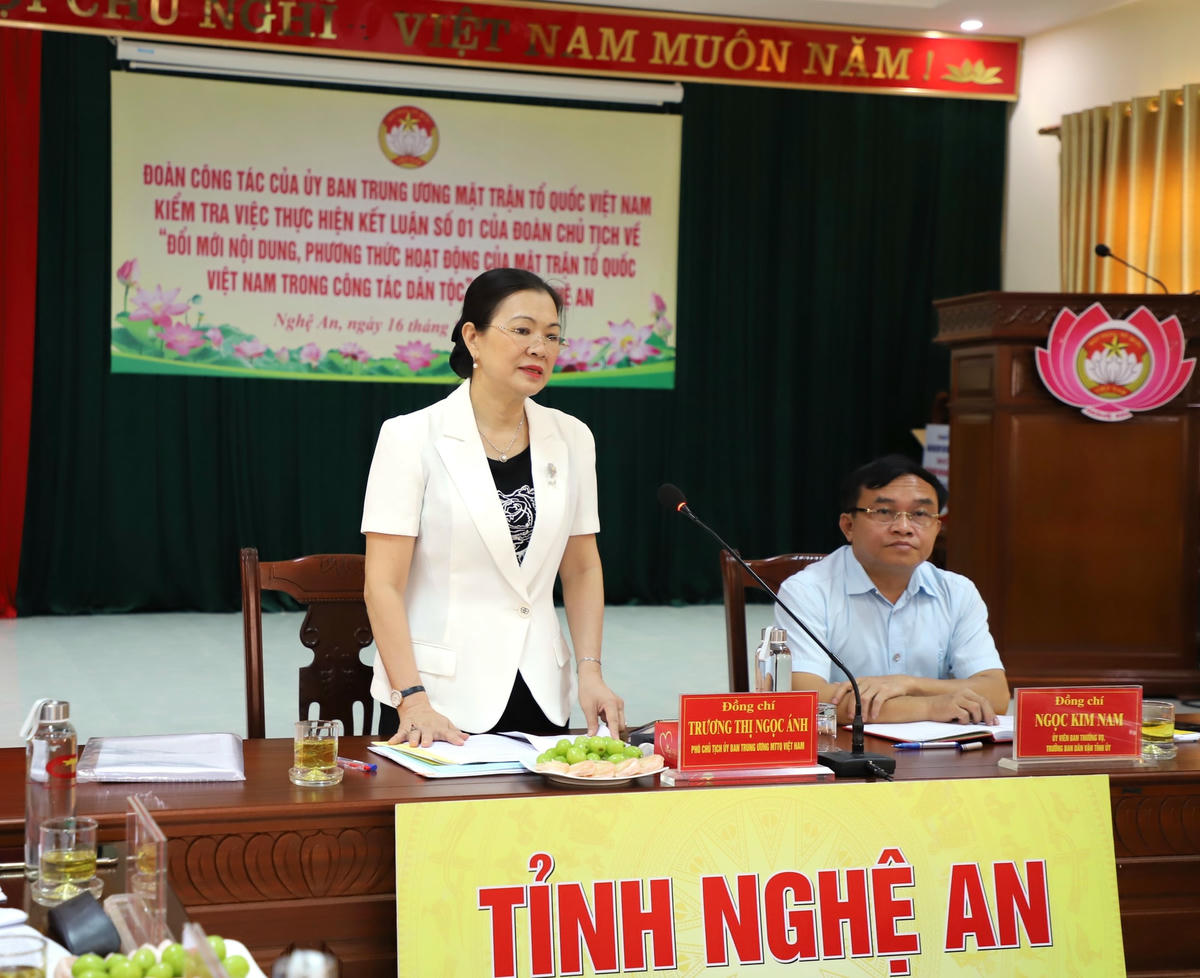 Kết luận tại buổi kiểm tra, bà Trương Thị Ngọc Ánh, Phó Chủ tịch Ủy ban Trung ương MTTQ Việt Nam đánh giá cao những chính sách đầu tư để phát triển vùng đồng bào dân tộc miền núi của tỉnh Nghệ An trong thời gian qua, nhất là việc thực hiện Kết luận 01 của Đoàn Chủ tịch của MTTQ các cấp.