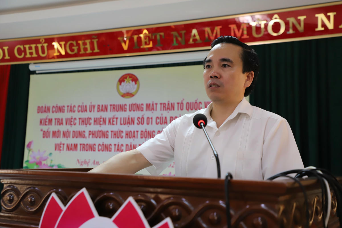 Tại buổi kiểm tra, theo ông Lê Văn Ngọc, Phó Chủ tịch Ủy ban MTTQ tỉnh Nghệ An cho biết, trong hơn 7 năm thực hiện Kết luận 01, Ban Thường trực Ủy ban MTTQ các cấp tỉnh Nghệ An đã bám sát các quan điểm chỉ đạo của Đảng về công tác dân tộc; sự chỉ đạo, hướng dẫn của Ban Thường trực Ủy ban Trung ương MTTQ Việt Nam và của cấp ủy, chính quyền các địa phương.