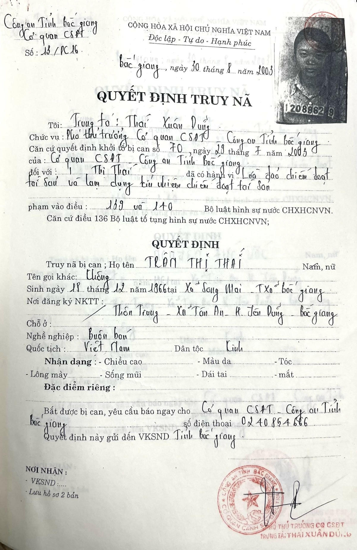 Sau khi xác định bị can đã bỏ trốn khỏi nơi cư trú, Cơ quan Cảnh sát điều tra Công an tỉnh Bắc Giang đã ra quyết định truy nã đặc biệt đối với Nguyễn Đức Ước và Trần Thị Thái.