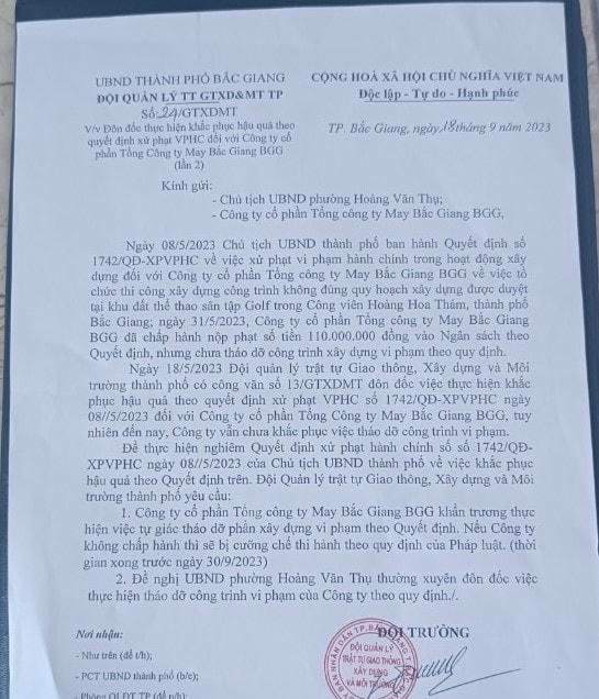 Đến ngày 31/5/2023, Đội Quản lý trật tự Giao thông, Xây dựng và Môi trường thành phố Bắc Giang có Văn bản gửi Chủ tịch UBND phường Hoàng Văn Thụ và Công ty cổ phần Tổng Công ty may Bắc Giang BGG về việc đôn đốc việc thực hiện khắc phục hậu quả theo Quyết định xử phạt.