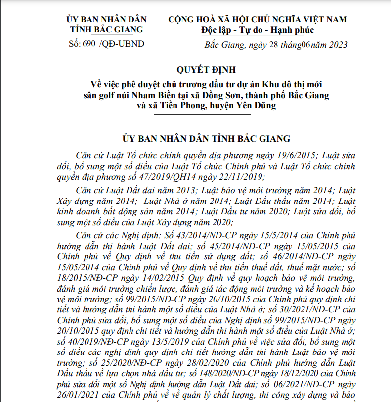 UBND tỉnh Bắc Giang vừa ban hành Quyết định về việc phê duyệt chủ trương đầu tư dự án Khu đô thị mới sân golf núi Nham Biền tại xã Đồng Sơn, thành phố Bắc Giang và xã Tiền Phong, huyện Yên Dũng.