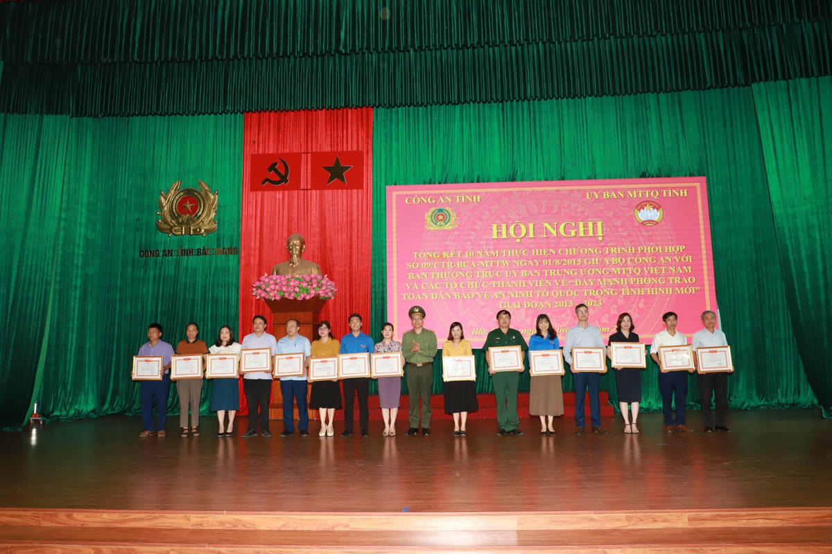 Dịp này, toàn tỉnh có 77 tập thể, cá nhân có thành tích xuất sắc trong thực hiện Chương trình phối hợp số 09 được nhận Bằng khen, Giấy khen của Ủy ban Trung ương MTTQ Việt Nam, Bộ Công an; Chủ tịch UBND, Chủ tịch Ủy ban MTTQ tỉnh và Giám đốc Công an tỉnh Bắc Giang.