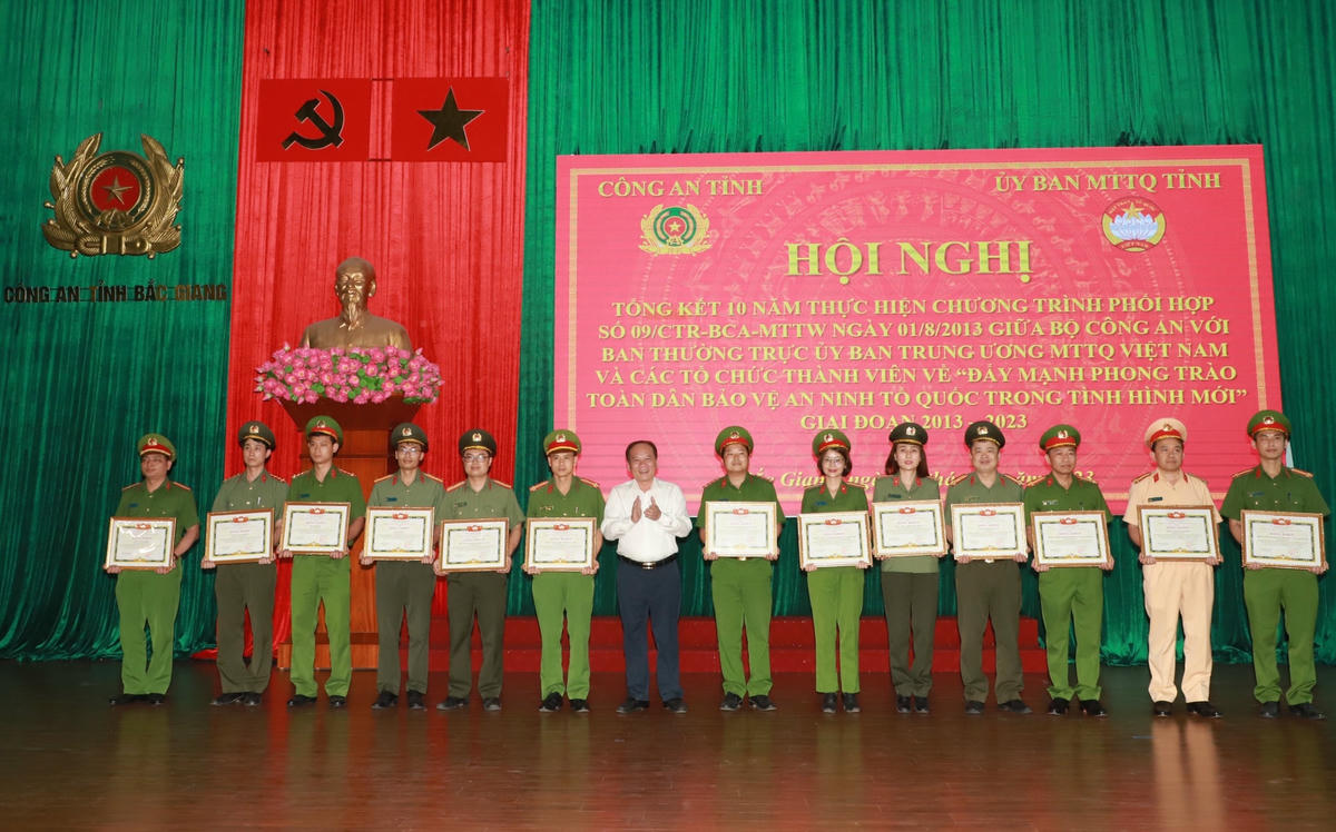 Ngày 23/5, Công an tỉnh Bắc Giang và Ủy ban MTTQ tỉnh Bắc Giang đã tổ chức Hội nghị tổng kết 10 năm thực hiện Chương trình phối hợp số 09/CTr-BCA-MTTW giữa Bộ Công an với Ban Thường trực Uỷ ban Trung ương MTTQ Việt Nam và các tổ chức thành viên về “Đẩy mạnh phong trào toàn dân bảo vệ an ninh Tổ quốc trong thời kỳ mới”, giai đoạn 2013 - 2023 (Chương trình số 09).