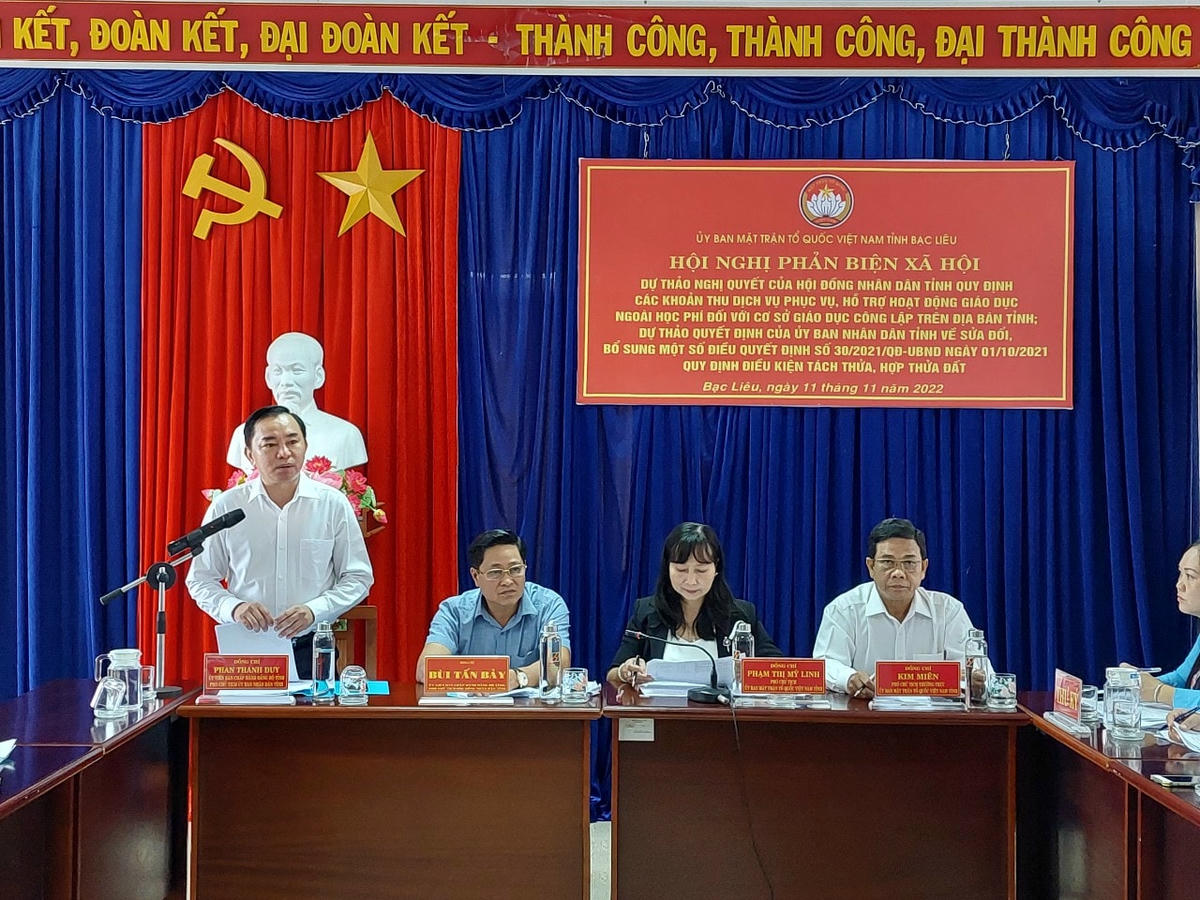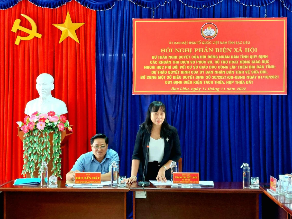 Phó Chủ tịch UBMTTQ tỉnh Bạc Liêu Phạm Thị Mỹ Linh cho biết, Ban Thường trực Ủy ban MTTQ tỉnh Bạc Liêu tổ chức Hội nghị phản biện xã hội về dự thảo Nghị quyết của HĐND tỉnh quy định mức thu học phí, phụ phí, chi phí dịch vụ phục vụ đối với cơ sở giáo dục công lập vàdự thảo Quyết định của Ủy ban nhân dân tỉnh về sửa đổi, bổ sung một số điều Quyết định số 30/2021/QĐ-UBND ngày 1/1/2021 quy định điều kiện tách thửa đất, điều kiện hợp thửa đất trên địa bàn tỉnh là những nội dung có liên quan, tác động trực tiếp đến đời sống xã hội của đại đa số người dân trên địa bàn tỉnh.