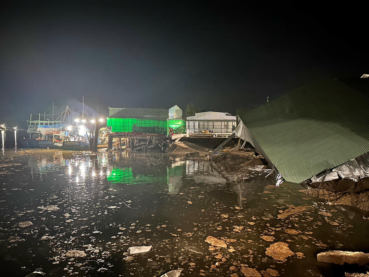 Sạt lở nghiêm trọng lúc nửa đêm khiến nhà xưởng một công ty chế biến bột cá ở huyện Đông Hải, tỉnh Bạc Liêu bị kéo tuột xuống sông, thiệt hơn 5 tỉ đồng.