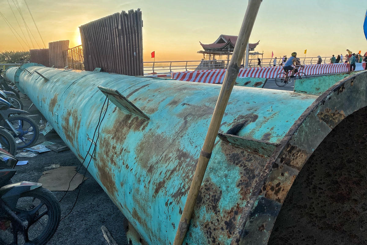 Theo ông Hoàng, kết cấu cầu vòm thép có khối lượng khoảng 1.200 tấn được chia thành 17 đốt, trong đó đốt nặng nhất lên tới 95 tấn. Do đó, từ tháng 9/2022, nhà thầu phải tiến hành lắp dựng đà giáo 2.400 tấn, cao 77m và sử dụng cẩu 800 tấn trên sà lan 7.800 tấn để cẩu các đốt vòm thép. Quá trình lắp dựng đà giáo cũng hết sức gian nan khi nhà thầu phải dùng hàng chục cọc ống thép đường kính 1,3m cắm xuống lòng sông ở độ sâu 38-40m so với mặt nước.